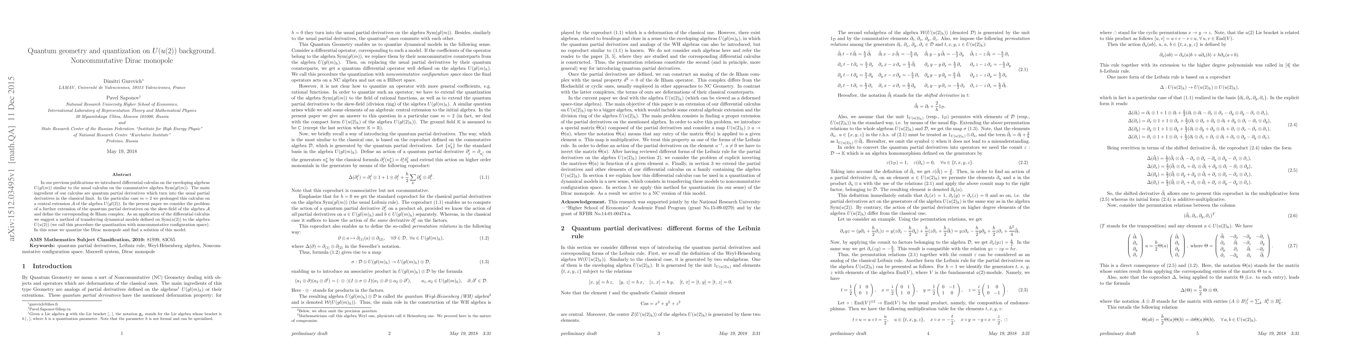 In our previous publications we introduced differential calculus on the enveloping algebras U(gl(m)) similar to the usual calculus on the commutative algebra Sym(gl(m)). The main ingredient of our calculus are quantum partial derivatives which turn into the usual partial derivatives in the classical limit. In the particular case m=2 we prolonged this calculus on a central extension A of the algebra U(gl(2)). In the present paper we consider the problem of a further extension of the quantum partial derivatives on the skew-field of the algebra A and define the corresponding de Rham complex. As an application of the differential calculus we suggest a method of transferring dynamical models defined on Sym(u(2)) to the algebra U(u(2)) (we call this procedure the quantization with noncommutative configuration space). In this sense we quantize the Dirac monopole and find a solution of this model.