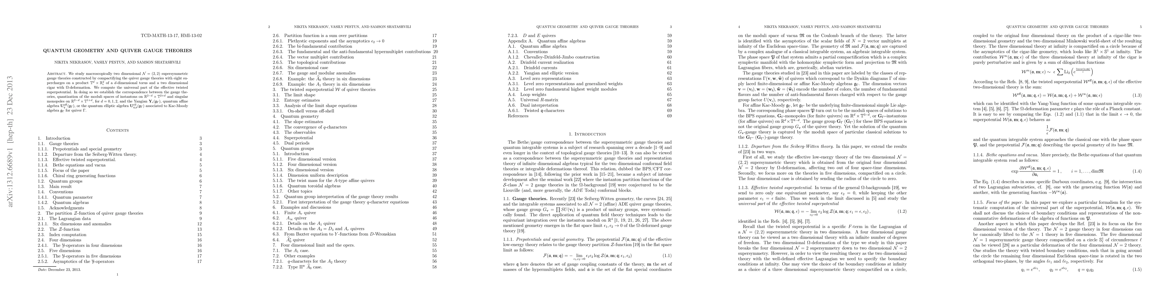 We study macroscopically two dimensional $\mathcal{N}=(2,2)$ supersymmetric gauge theories constructed by compactifying the quiver gauge theories with eight supercharges on a product $\mathbb{T}^{d} \times \mathbb{R}^{2}_{\epsilon}$ of a $d$-dimensional torus and a two dimensional cigar with $\Omega$-deformation. We compute the universal part of the effective twisted superpotential. In doing so we establish the correspondence between the gauge theories, quantization of the moduli spaces of instantons on $\mathbb{R}^{2-d} \times \mathbb{T}^{2+d}$ and singular monopoles on $\mathbb{R}^{2-d} \times \mathbb{T}^{1+d}$, for $d=0,1,2$, and the Yangian $\mathbf{Y}_{\epsilon}(\mathfrak{g}_{\Gamma})$, quantum affine algebra $\mathbf{U}^{\mathrm{aff}}_q(\mathfrak{g}_{\Gamma})$, or the quantum elliptic algebra $\mathbf{U}^{\mathrm{ell}}_{q,p}(\mathfrak{g}_{\Gamma})$ associated to Kac-Moody algebra $\mathfrak{g}_{\Gamma}$ for quiver $\Gamma$.