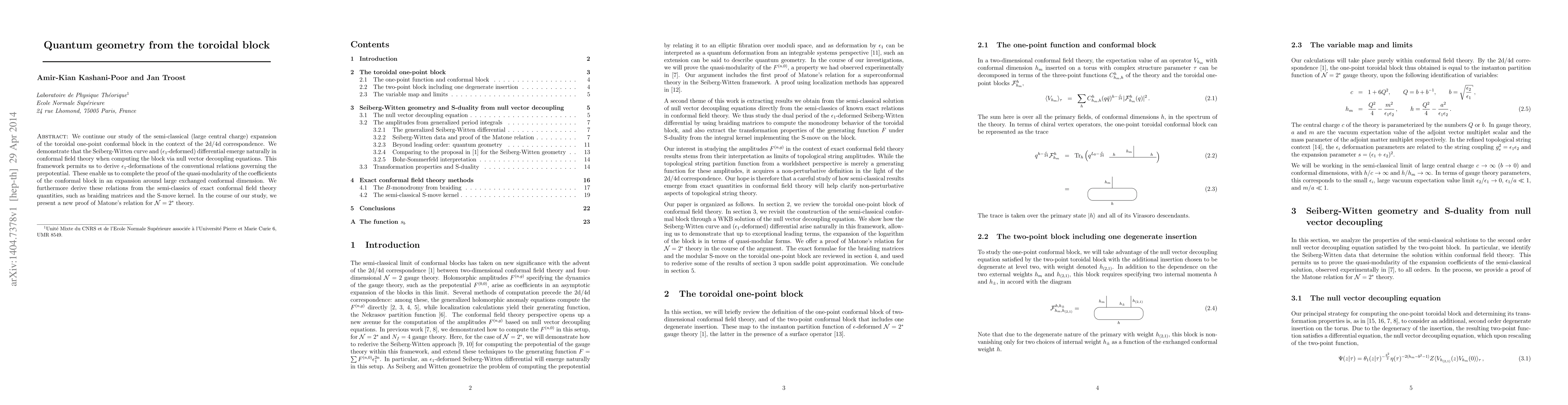 We continue our study of the semi-classical (large central charge) expansion of the toroidal one-point conformal block in the context of the 2d/4d correspondence. We demonstrate that the Seiberg-Witten curve and (epsilon1-deformed) differential emerge naturally in conformal field theory when computing the block via null vector decoupling equations. This framework permits us to derive epsilon1-deformations of the conventional relations governing the prepotential. These enable us to complete the proof of the quasi-modularity of the coefficients of the conformal block in an expansion around large exchanged conformal dimension. We furthermore derive these relations from the semi-classics of exact conformal field theory quantities, such as braiding matrices and the S-move kernel. In the course of our study, we present a new proof of Matone's relation for N=2* theory.