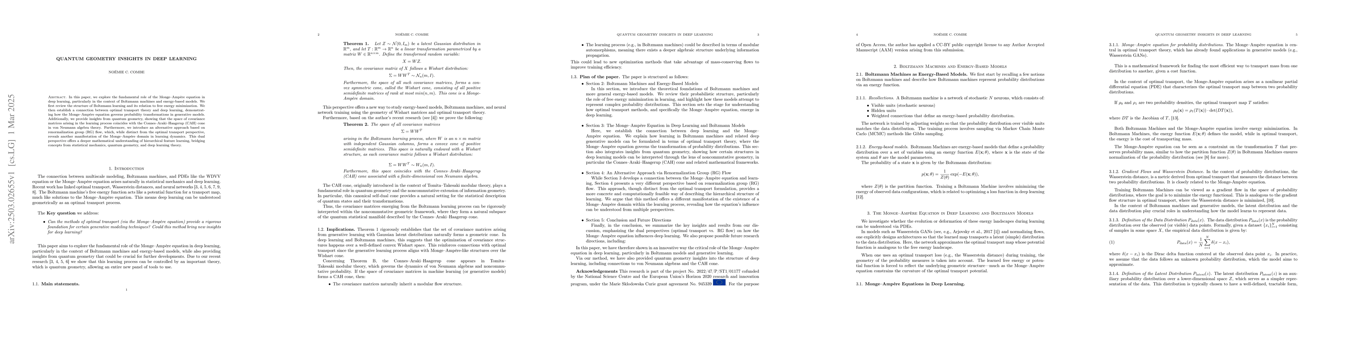 The paper explores the role of the Monge-Ampère equation in deep learning, particularly in Boltzmann machines and energy-based models. It connects optimal transport theory with deep learning, demonstrating how the Monge-Ampère equation governs probability transformations in generative models. The research also integrates insights from quantum geometry, showing that the space of covariance matrices corresponds to the Connes-Araki-Haagerup (CAH) cone in von Neumann algebra theory. Additionally, it introduces an alternative approach based on renormalization group (RG) flow, offering a deeper understanding of hierarchical feature learning.