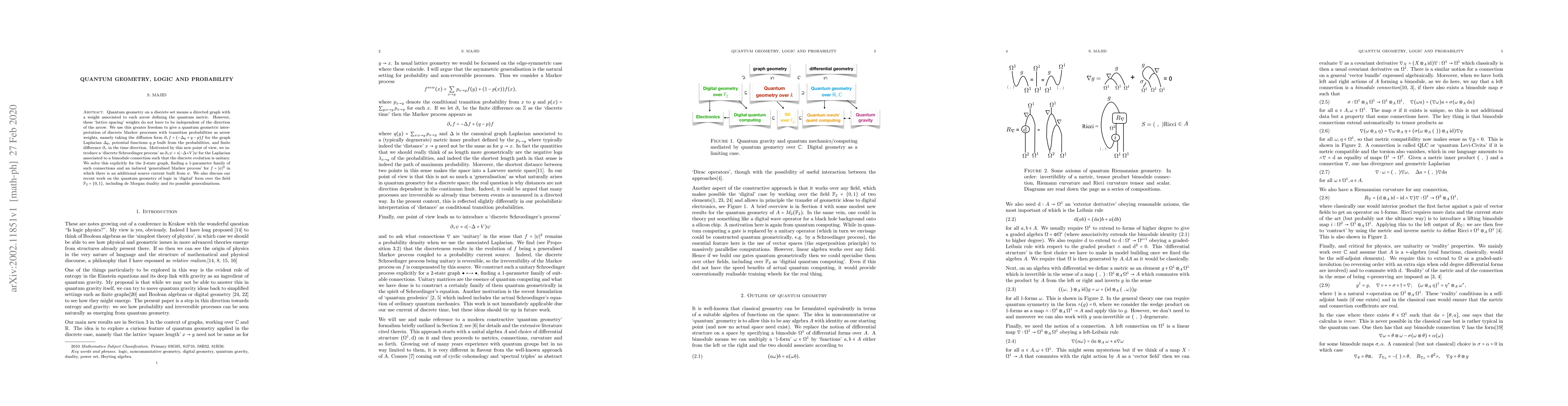 Quantum geometry on a discrete set means a directed graph with a weight associated to each arrow defining the quantum metric. However, these `lattice spacing' weights do not have to be independent of the direction of the arrow. We use this greater freedom to give a quantum geometric interpretation of discrete Markov processes with transition probabilities as arrow weights, namely taking the diffusion form $\partial_+ f=(-\Delta_\theta+ q-p)f$ for the graph Laplacian $\Delta_\theta$, potential functions $q,p$ built from the probabilities, and finite difference $\partial_+$ in the time direction. Motivated by this new point of view, we introduce a `discrete Schroedinger process' as $\partial_+\psi=\imath(-\Delta+V)\psi$ for the Laplacian associated to a bimodule connection such that the discrete evolution is unitary. We solve this explicitly for the 2-state graph, finding a 1-parameter family of such connections and an induced `generalised Markov process' for $f=|\psi|^2$ in which there is an additional source current built from $\psi$. We also discuss our recent work on the quantum geometry of logic in `digital' form over the field $\Bbb F_2=\{0,1\}$, including de Morgan duality and its possible generalisations.