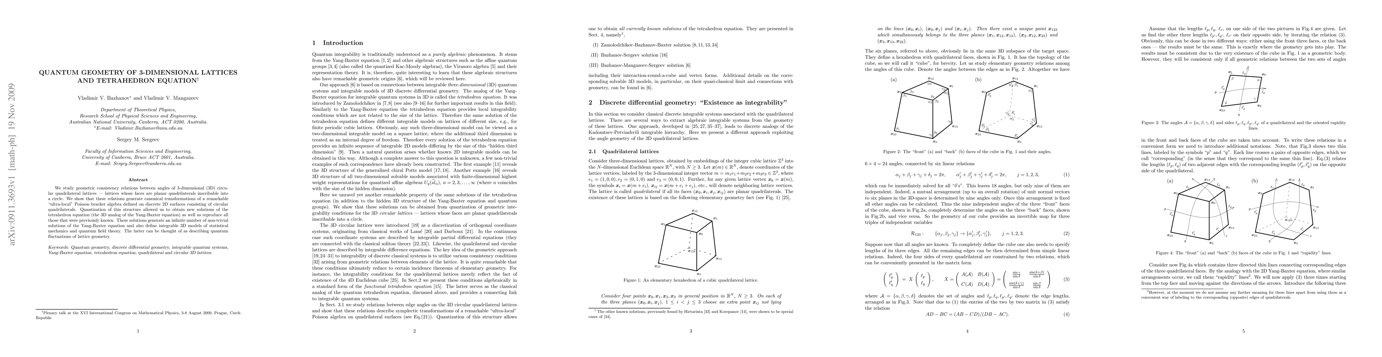 We study geometric consistency relations between angles of 3-dimensional (3D) circular quadrilateral lattices -- lattices whose faces are planar quadrilaterals inscribable into a circle. We show that these relations generate canonical transformations of a remarkable "ultra-local" Poisson bracket algebra defined on discrete 2D surfaces consisting of circular quadrilaterals. Quantization of this structure allowed us to obtain new solutions of the tetrahedron equation (the 3D analog of the Yang-Baxter equation) as well as reproduce all those that were previously known. These solutions generate an infinite number of non-trivial solutions of the Yang-Baxter equation and also define integrable 3D models of statistical mechanics and quantum field theory. The latter can be thought of as describing quantum fluctuations of lattice geometry.