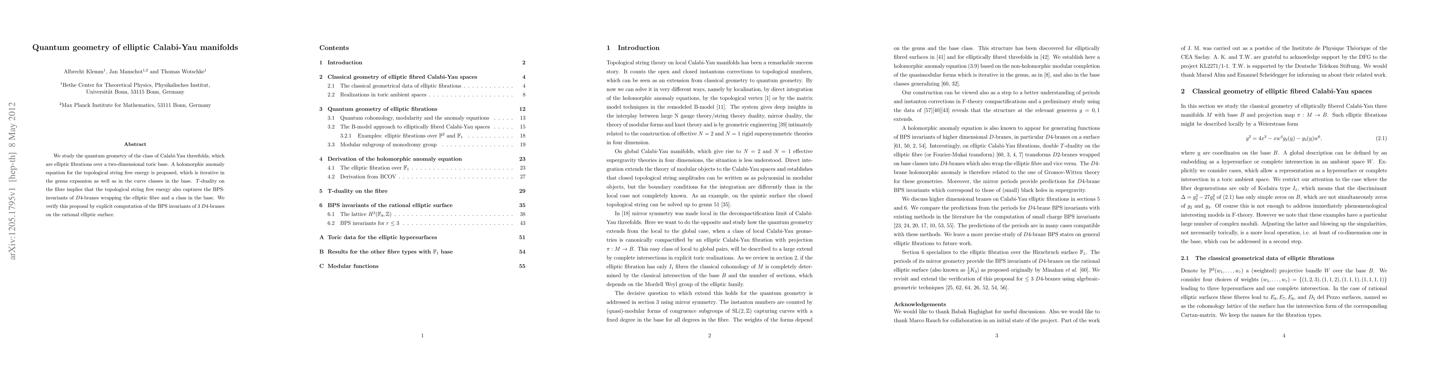 We study the quantum geometry of the class of Calabi-Yau threefolds, which are elliptic fibrations over a two-dimensional toric base. A holomorphic anomaly equation for the topological string free energy is proposed, which is iterative in the genus expansion as well as in the curve classes in the base. T-duality on the fibre implies that the topological string free energy also captures the BPS-invariants of D4-branes wrapping the elliptic fibre and a class in the base. We verify this proposal by explicit computation of the BPS invariants of 3 D4-branes on the rational elliptic surface.