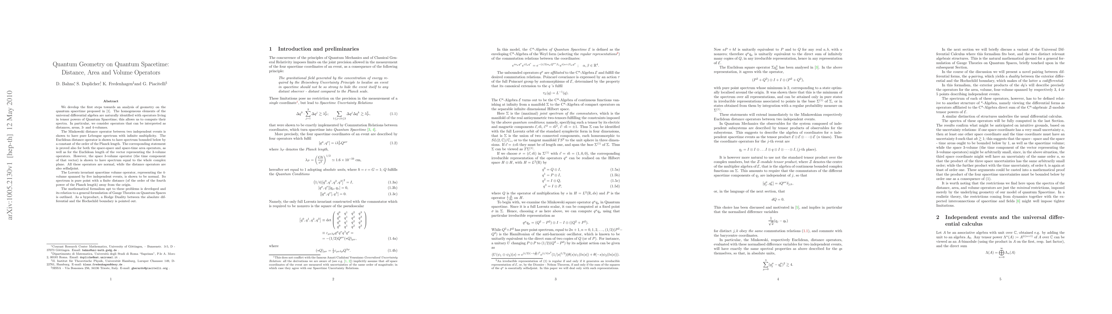 We develop the first steps towards an analysis of geometry on the quantum spacetime proposed in [1]. The homogeneous elements of the universal differential algebra are naturally identified with operators living in tensor powers of Quantum Spacetime; this allows us to compute their spectra. In particular, we consider operators that can be interpreted as distances, areas, 3- and 4-volumes. The Minkowski distance operator between two independent events is shown to have pure Lebesgue spectrum with infinite multiplicity. The Euclidean distance operator is shown to have spectrum bounded below by a constant of the order of the Planck length. The corresponding statement is proved also for both the space-space and space-time area operators, as well as for the Euclidean length of the vector representing the 3-volume operators. However, the space 3-volume operator (the time component of that vector) is shown to have spectrum equal to the whole complex plane. All these operators are normal, while the distance operators are also selfadjoint. The Lorentz invariant spacetime volume operator, representing the 4- volume spanned by five independent events, is shown to be normal. Its spectrum is pure point with a finite distance (of the order of the fourth power of the Planck length) away from the origin. The mathematical formalism apt to these problems is developed and its relation to a general formulation of Gauge Theories on Quantum Spaces is outlined. As a byproduct, a Hodge Duality between the absolute dif- ferential and the Hochschild boundary is pointed out.