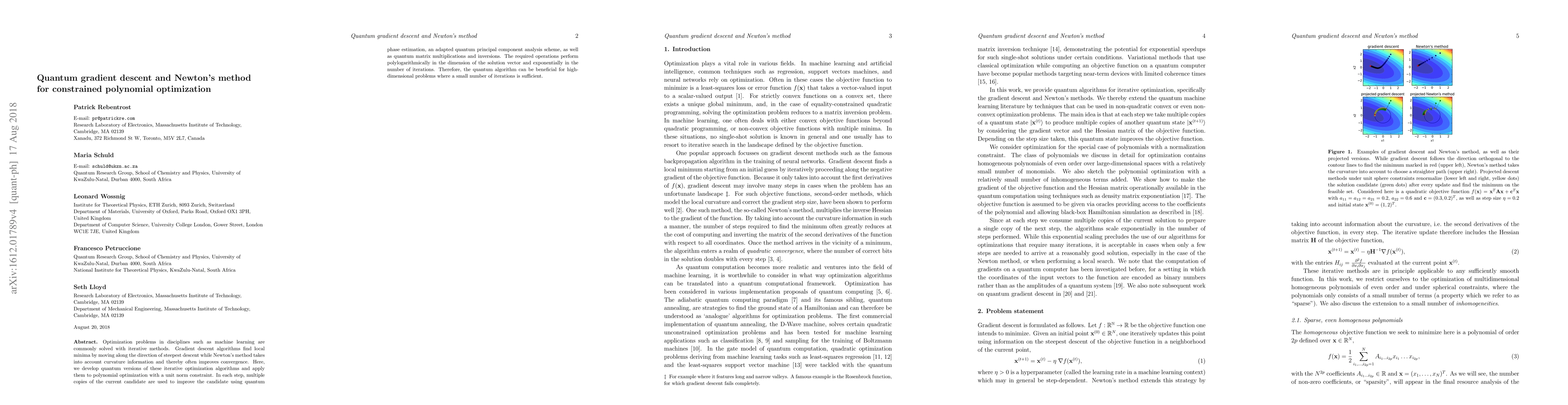 Optimization problems in disciplines such as machine learning are commonly solved with iterative methods. Gradient descent algorithms find local minima by moving along the direction of steepest descent while Newton's method takes into account curvature information and thereby often improves convergence. Here, we develop quantum versions of these iterative optimization algorithms and apply them to polynomial optimization with a unit norm constraint. In each step, multiple copies of the current candidate are used to improve the candidate using quantum phase estimation, an adapted quantum principal component analysis scheme, as well as quantum matrix multiplications and inversions. The required operations perform polylogarithmically in the dimension of the solution vector and exponentially in the number of iterations. Therefore, the quantum algorithm can be beneficial for high-dimensional problems where a small number of iterations is sufficient.