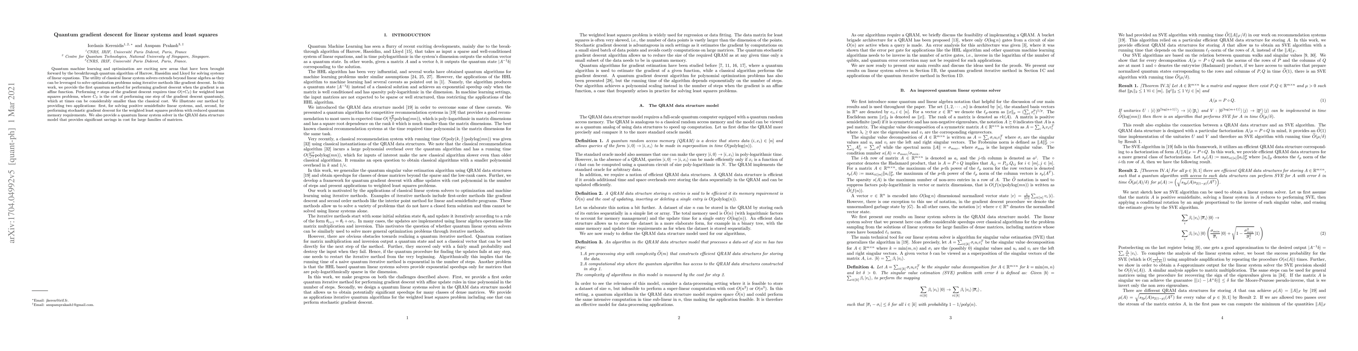 Quantum machine learning and optimization are exciting new areas that have been brought forward by the breakthrough quantum algorithm of Harrow, Hassidim and Lloyd for solving systems of linear equations. The utility of {classical} linear system solvers extends beyond linear algebra as they can be leveraged to solve optimization problems using iterative methods like gradient descent. In this work, we provide the first quantum method for performing gradient descent when the gradient is an affine function. Performing $\tau$ steps of the gradient descent requires time $O(\tau C_S)$ for weighted least squares problems, where $C_S$ is the cost of performing one step of the gradient descent quantumly, which at times can be considerably smaller than the classical cost. We illustrate our method by providing two applications: first, for solving positive semidefinite linear systems, and, second, for performing stochastic gradient descent for the weighted least squares problem with reduced quantum memory requirements. We also provide a quantum linear system solver in the QRAM data structure model that provides significant savings in cost for large families of matrices.