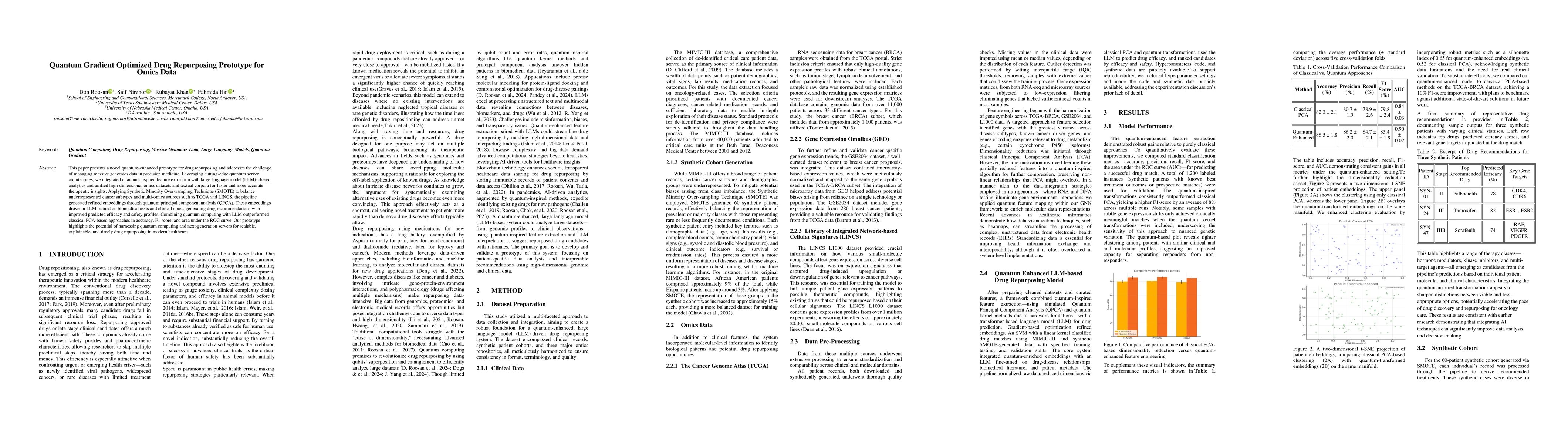 The research utilized the MIMIC-III database, SMOTE for synthetic cohort generation, and omics data from TCGA, GEO, and LINCS. Quantum-inspired feature extraction combined with a transformer-based language model (LLM) was employed for drug prediction, followed by gradient-based optimization and SVM classification.