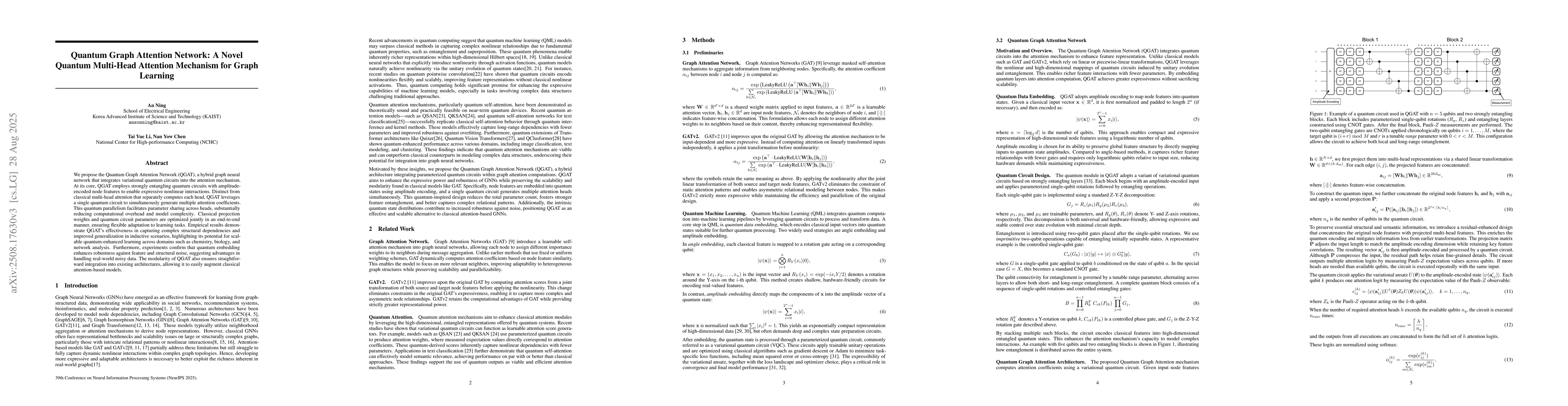 We propose the Quantum Graph Attention Network (QGAT), a hybrid graph neural network that integrates variational quantum circuits into the attention mechanism. At its core, QGAT employs strongly entangling quantum circuits with amplitude-encoded node features to enable expressive nonlinear interactions. Distinct from classical multi-head attention that separately computes each head, QGAT leverages a single quantum circuit to simultaneously generate multiple attention coefficients. This quantum parallelism facilitates parameter sharing across heads, substantially reducing computational overhead and model complexity. Classical projection weights and quantum circuit parameters are optimized jointly in an end-to-end manner, ensuring flexible adaptation to learning tasks. Empirical results demonstrate QGAT's effectiveness in capturing complex structural dependencies and improved generalization in inductive scenarios, highlighting its potential for scalable quantum-enhanced learning across domains such as chemistry, biology, and network analysis. Furthermore, experiments confirm that quantum embedding enhances robustness against feature and structural noise, suggesting advantages in handling real-world noisy data. The modularity of QGAT also ensures straightforward integration into existing architectures, allowing it to easily augment classical attention-based models.