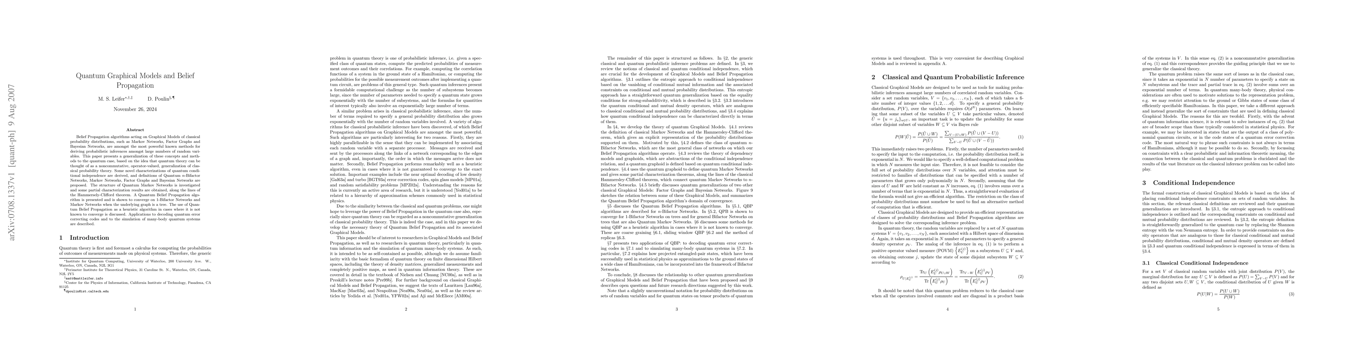 This paper generalizes classical belief propagation algorithms to quantum graphical models, proposing quantum versions of Markov Networks, Factor Graphs, and Bayesian Networks. It introduces a Quantum Belief Propagation algorithm that converges on tree-structured quantum networks and discusses its applications in quantum error correction and many-body quantum systems.