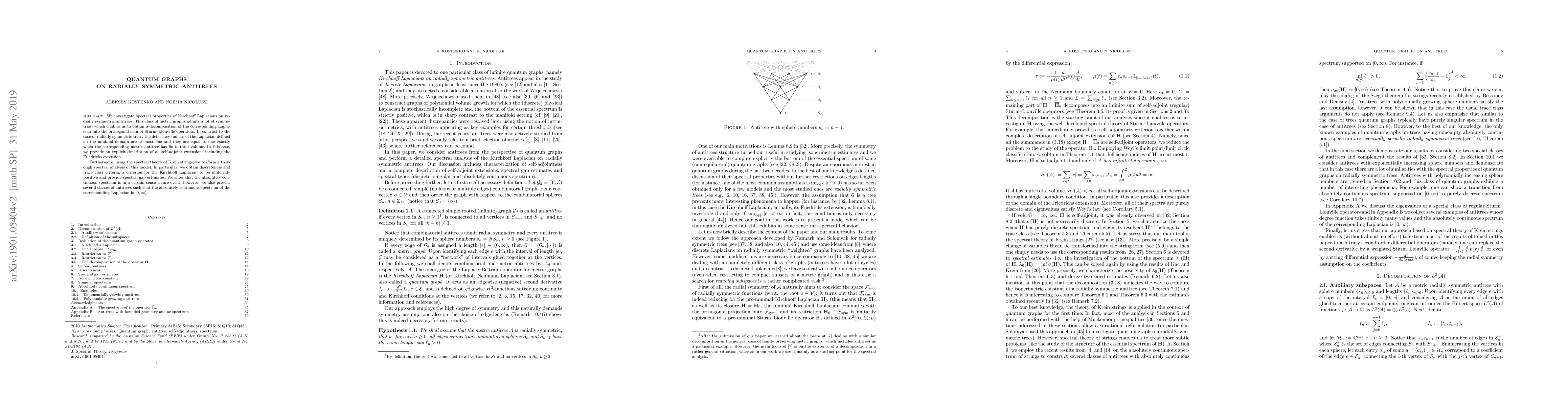 We investigate spectral properties of Kirchhoff Laplacians on radially symmetric antitrees. This class of metric graphs enjoys a rich group of symmetries, which enables us to obtain a decomposition of the corresponding Laplacian into the orthogonal sum of Sturm--Liouville operators. In contrast to the case of radially symmetric trees, the deficiency indices of the Laplacian defined on the minimal domain are at most one and they are equal to one exactly when the corresponding metric antitree has finite total volume. In this case, we provide an explicit description of all self-adjoint extensions including the Friedrichs extension. Furthermore, using the spectral theory of Krein strings, we perform a thorough spectral analysis of this model. In particular, we obtain discreteness and trace class criteria, criterion for the Kirchhoff Laplacian to be uniformly positive and provide spectral gap estimates. We show that the absolutely continuous spectrum is in a certain sense a rare event, however, we also present several classes of antitrees such that the absolutely continuous spectrum of the corresponding Laplacian is $[0,\infty)$.