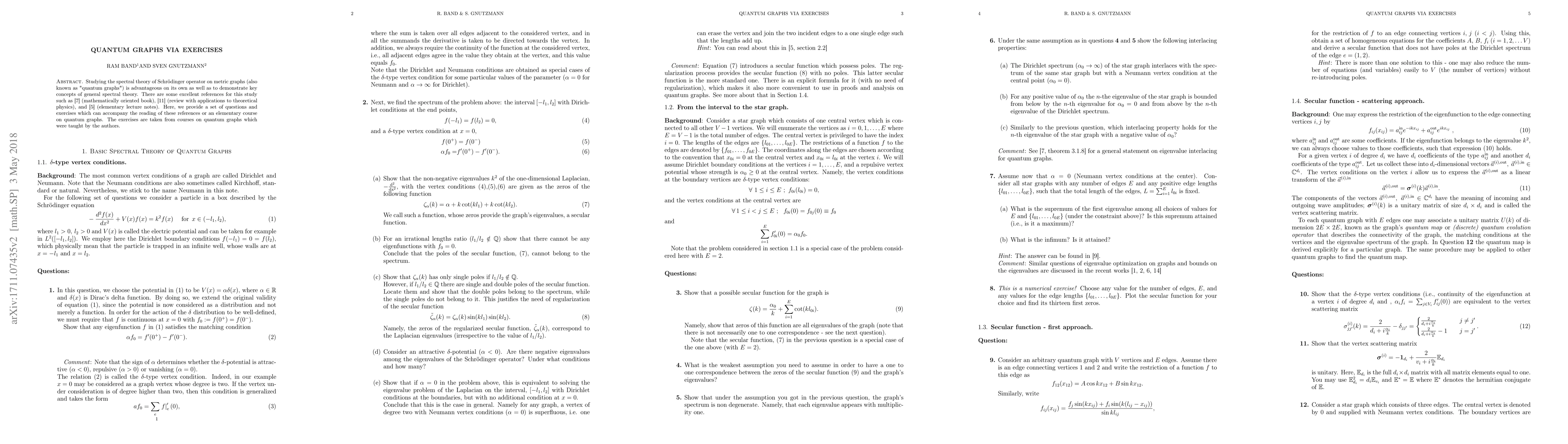 Studying the spectral theory of Schroedinger operator on metric graphs (also known as quantum graphs) is advantageous on its own as well as to demonstrate key concepts of general spectral theory. There are some excellent references for this study such as a mathematically oriented book by Berkolaiko and Kuchment, a review with applications to theoretical physicsby Gnutzmann and Smilansky, and elementary lecture notes by Berkolaiko. Here, we provide a set of questions and exercises which can accompany the reading of these references or an elementary course on quantum graphs. The exercises are taken from courses on quantum graphs which were taught by the authors.