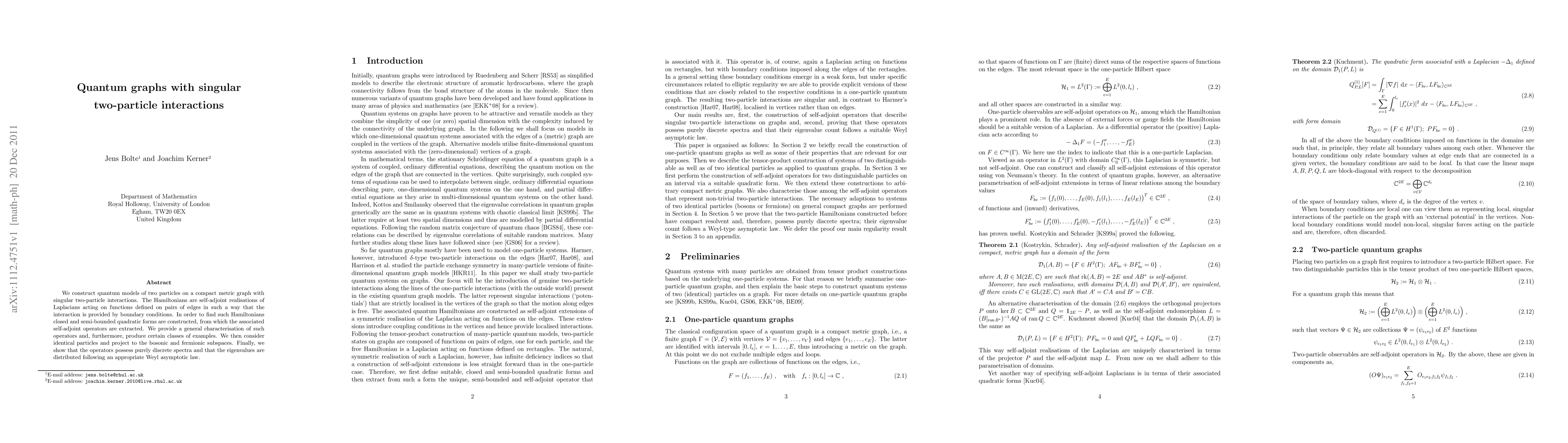 This paper constructs quantum models of two particles on compact metric graphs with singular interactions defined by boundary conditions. It characterizes the self-adjoint Hamiltonians and demonstrates that these operators have purely discrete spectra following a Weyl asymptotic law.
