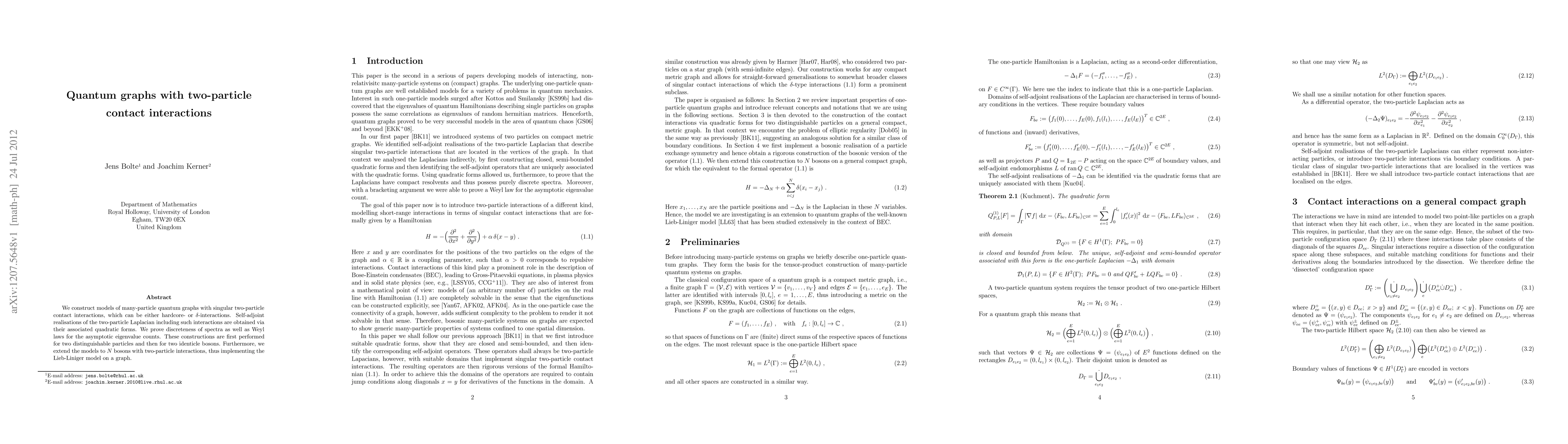 This paper constructs quantum graph models with singular two-particle contact interactions, proving discrete spectra and Weyl laws for eigenvalue counts. The models are extended to include N bosons, implementing the Lieb-Liniger model on a graph.