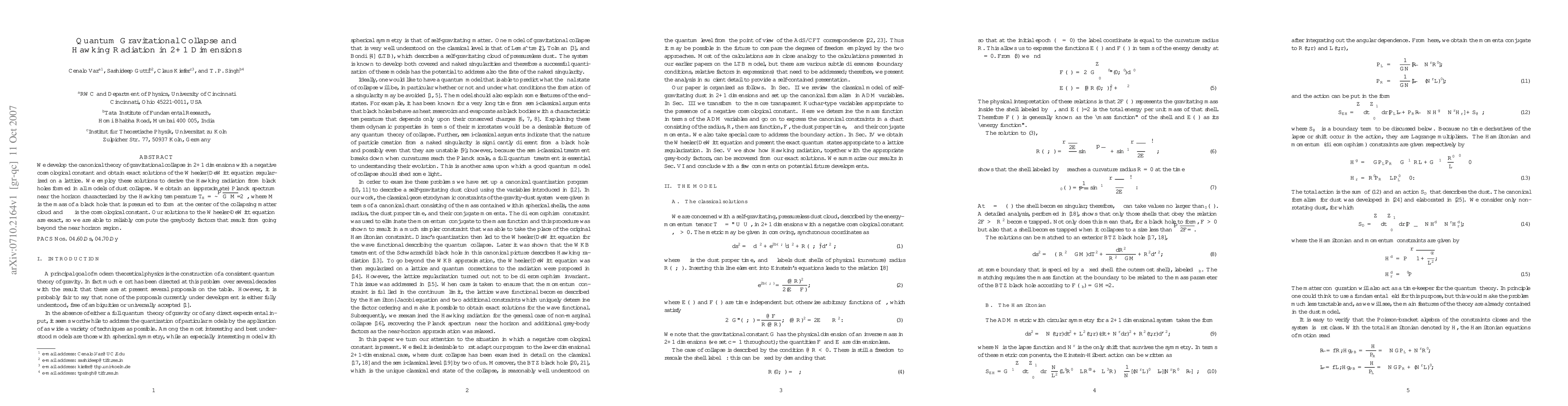 This paper develops a canonical theory for gravitational collapse in 2+1 dimensions with a negative cosmological constant, deriving exact solutions to the Wheeler-DeWitt equation and demonstrating Hawking radiation with an approximate Planck spectrum from black holes formed in dust collapse models.