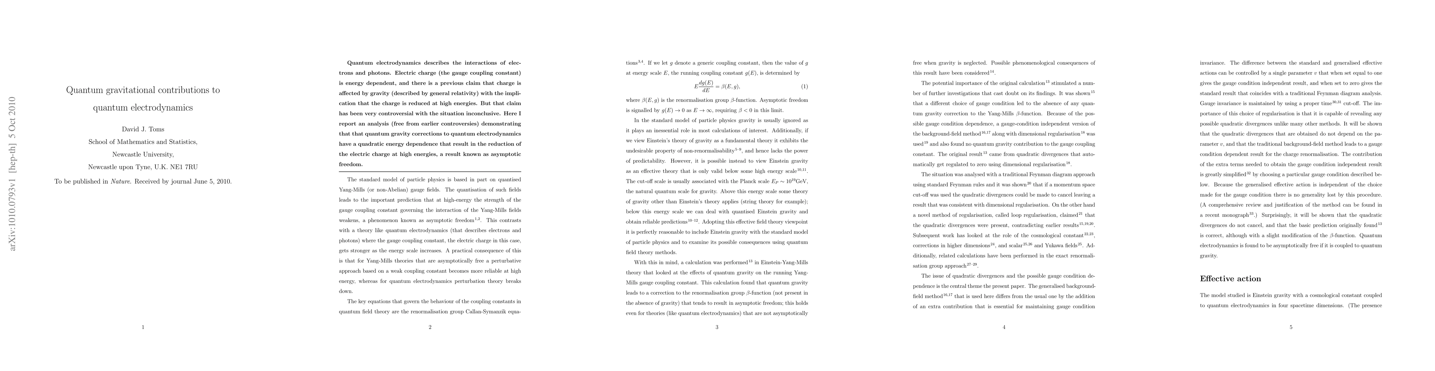 This paper presents a new analysis showing that quantum gravity corrections to quantum electrodynamics lead to a quadratic energy dependence, resulting in the reduction of electric charge at high energies, thus supporting the concept of asymptotic freedom. This finding resolves previous controversies regarding the gravitational influence on electric charge.