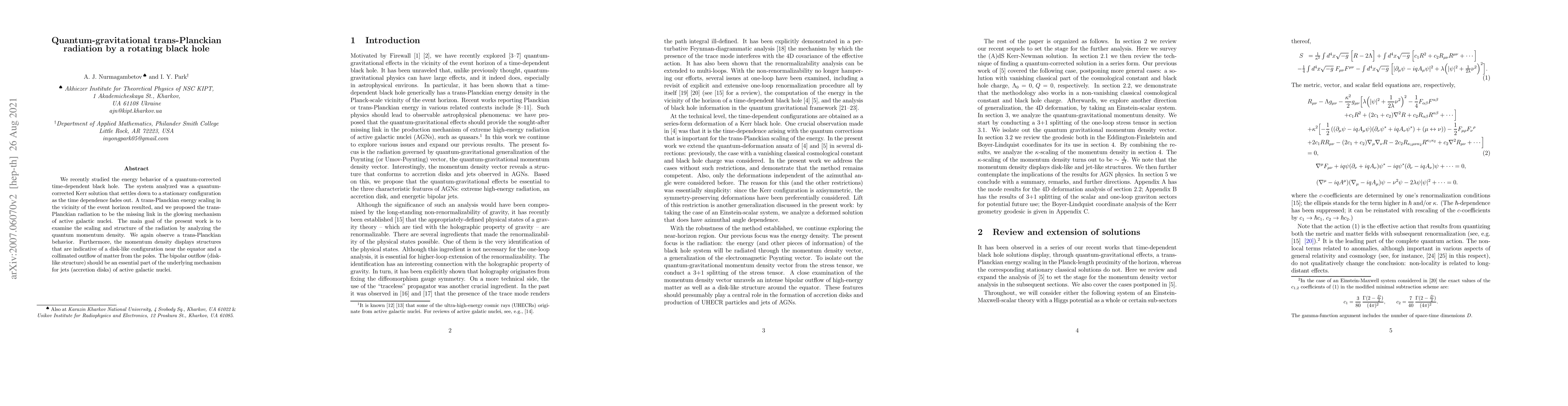 We recently studied the energy behavior of a quantum-corrected time-dependent black hole. The system analyzed was a quantum-corrected Kerr solution that settles down to a stationary configuration as the time dependence fades out. A trans-Planckian energy scaling in the vicinity of the event horizon resulted, and we proposed the trans-Planckian radiation to be the missing link in the glowing mechanism of active galactic nuclei. The main goal of the present work is to examine the scaling and structure of the radiation by analyzing the quantum momentum density. We again observe a trans-Planckian behavior. Furthermore, the momentum density displays structures that are indicative of a disk-like configuration near the equator and a collimated outflow of matter from the poles. The bipolar outflow (disk-like structure) should be an essential part of the underlying mechanism for jets (accretion disks) of active galactic nuclei.