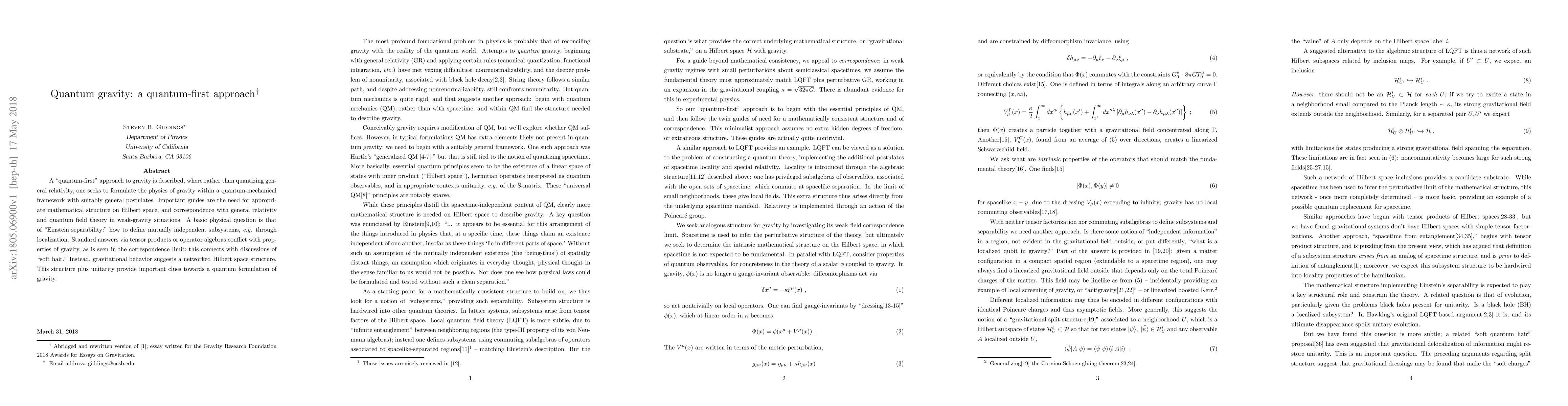 A "quantum-first" approach to gravity is described, where rather than quantizing general relativity, one seeks to formulate the physics of gravity within a quantum-mechanical framework with suitably general postulates. Important guides are the need for appropriate mathematical structure on Hilbert space, and correspondence with general relativity and quantum field theory in weak-gravity situations. A basic physical question is that of "Einstein separability:" how to define mutually independent subsystems, e.g. through localization. Standard answers via tensor products or operator algebras conflict with properties of gravity, as is seen in the correspondence limit; this connects with discussions of "soft hair." Instead, gravitational behavior suggests a networked Hilbert space structure. This structure plus unitarity provide important clues towards a quantum formulation of gravity.
