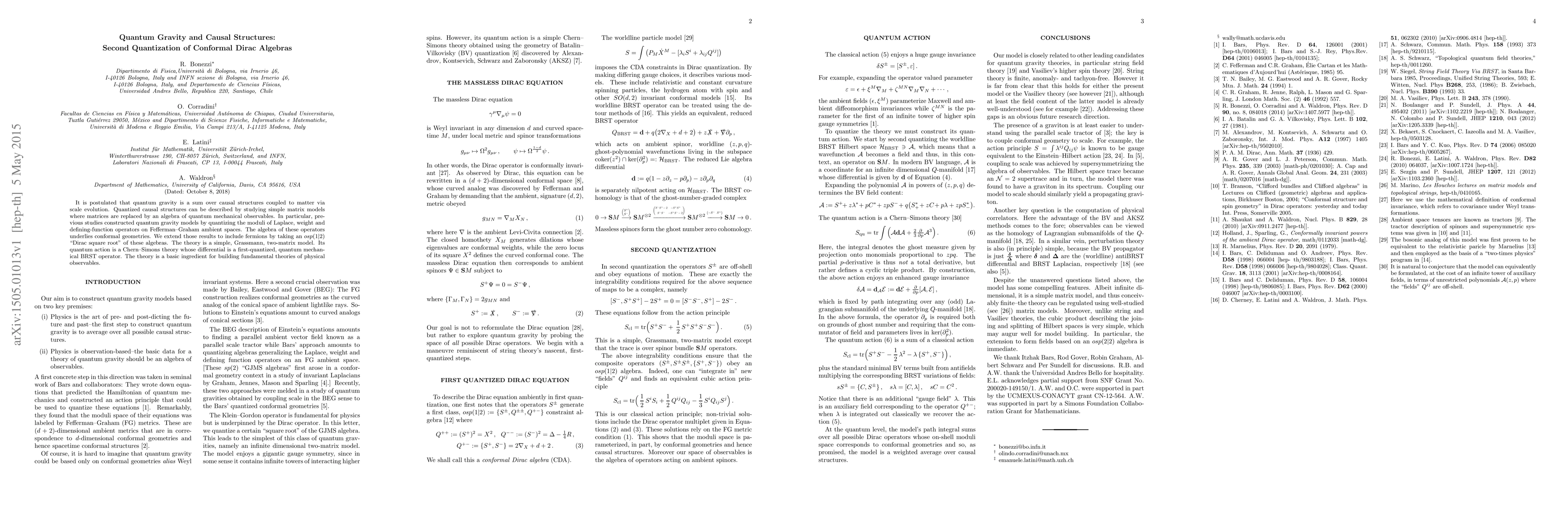 It is postulated that quantum gravity is a sum over causal structures coupled to matter via scale evolution. Quantized causal structures can be described by studying simple matrix models where matrices are replaced by an algebra of quantum mechanical observables. In particular, previous studies constructed quantum gravity models by quantizing the moduli of Laplace, weight and defining-function operators on Fefferman-Graham ambient spaces. The algebra of these operators underlies conformal geometries. We extend those results to include fermions by taking an osp(1|2) "Dirac square root" of these algebras. The theory is a simple, Grassmann, two-matrix model. Its quantum action is a Chern-Simons theory whose differential is a first-quantized, quantum mechanical BRST operator. The theory is a basic ingredient for building fundamental theories of physical observables.