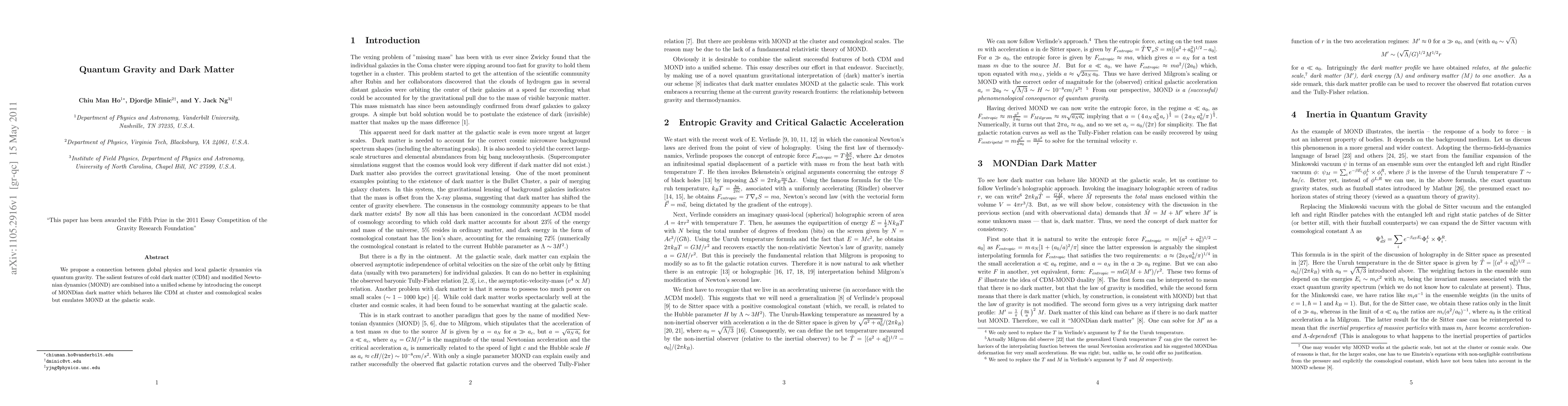 We propose a connection between global physics and local galactic dynamics via quantum gravity. The salient features of cold dark matter (CDM) and modified Newtonian dynamics (MOND) are combined into a unified scheme by introducing the concept of MONDian dark matter which behaves like CDM at cluster and cosmological scales but emulates MOND at the galactic scale.