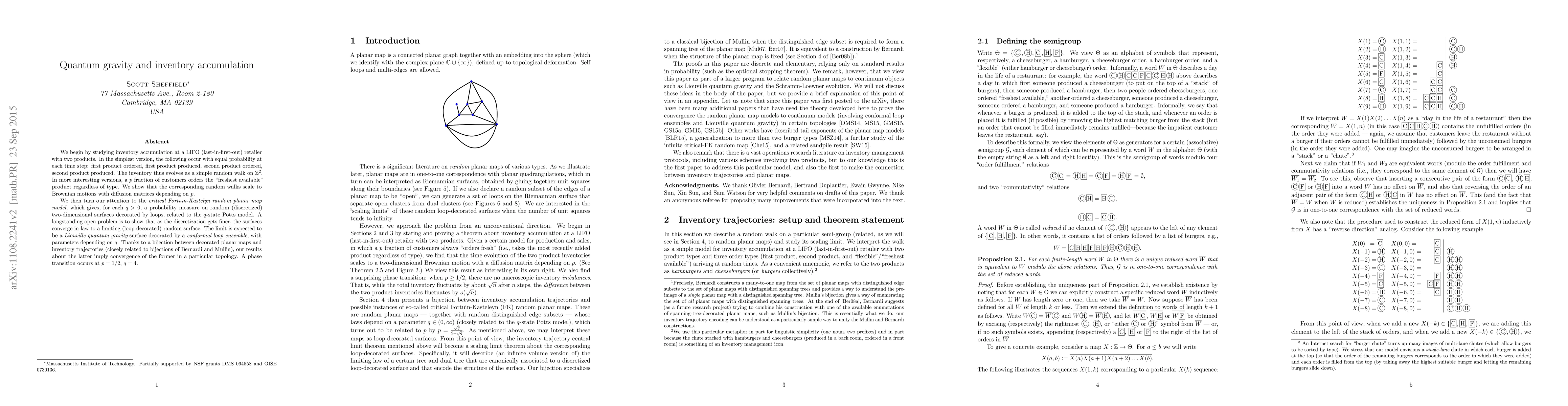We begin by studying inventory accumulation at a LIFO (last-in-first-out) retailer with two products. In the simplest version, the following occur with equal probability at each time step: first product ordered, first product produced, second product ordered, second product produced. The inventory thus evolves as a simple random walk on Z^2. In more interesting versions, a p fraction of customers orders the "freshest available" product regardless of type. We show that the corresponding random walks scale to Brownian motions with diffusion matrices depending on p. We then turn our attention to the critical Fortuin-Kastelyn random planar map model, which gives, for each q>0, a probability measure on random (discretized) two-dimensional surfaces decorated by loops, related to the q-state Potts model. A longstanding open problem is to show that as the discretization gets finer, the surfaces converge in law to a limiting (loop-decorated) random surface. The limit is expected to be a Liouville quantum gravity surface decorated by a conformal loop ensemble, with parameters depending on q. Thanks to a bijection between decorated planar maps and inventory trajectories (closely related to bijections of Bernardi and Mullin), our results about the latter imply convergence of the former in a particular topology. A phase transition occurs at p = 1/2, q=4.
