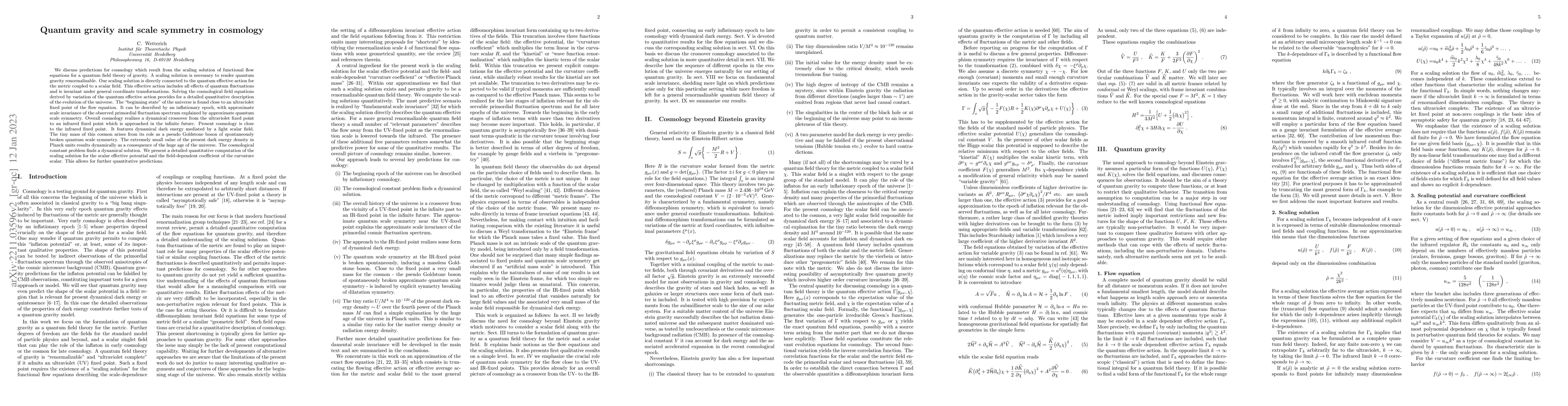 We discuss predictions for cosmology which result from the scaling solution of functional flow equations for a quantum field theory of gravity. A scaling solution is necessary to render quantum gravity renormalizable. Our scaling solution is directly connected to the quantum effective action for the metric coupled to a scalar field. It includes all effects of quantum fluctuations and is invariant under general coordinate transformations. Solving the cosmological field equations derived by variation of the quantum effective action provides for a detailed quantitative description of the evolution of the universe. The \qq{beginning state} of the universe is found close to an ultraviolet fixed point of the flow equation. It can be described by an inflationary epoch, with approximate scale invariance of the observed primordial fluctuation spectrum explained by approximate quantum scale symmetry. Overall cosmology realizes a dynamical crossover from the ultraviolet fixed point to an infrared fixed point which is approached in the infinite future. Present cosmology is close to the infrared fixed point. It features dynamical dark energy mediated by a light scalar field. The tiny mass of this cosmon arises from its role as a pseudo Goldstone boson of spontaneously broken quantum scale symmetry. The extremely small value of the present dark energy density in Planck units results dynamically as a consequence of the huge age of the universe. The cosmological constant problem finds a dynamical solution. We present a detailed quantitative computation of the scaling solution for the scalar effective potential and the field-dependent coefficient of the curvature scalar. This allows for further quantitative predictions.