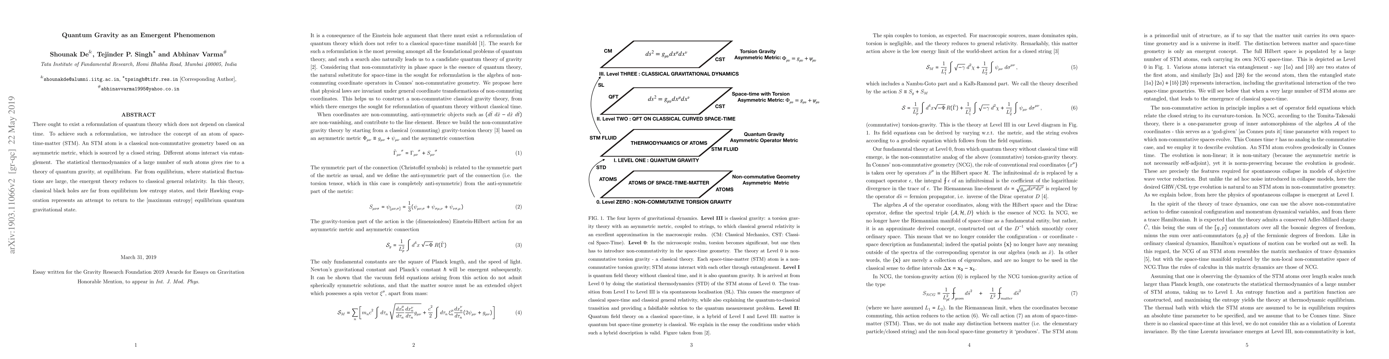 There ought to exist a reformulation of quantum theory which does not depend on classical time. To achieve such a reformulation, we introduce the concept of an atom of space-time-matter (STM). An STM atom is a classical non-commutative geometry, based on an asymmetric metric, and sourced by a closed string. Different such atoms interact via entanglement. The statistical thermodynamics of a large number of such atoms gives rise, at equilibrium, to a theory of quantum gravity. Far from equilibrium, where statistical fluctuations are large, the emergent theory reduces to classical general relativity. In this theory, classical black holes are far-from-equilibrium low entropy states, and their Hawking evaporation represents an attempt to return to the (maximum entropy) equilibrium quantum gravitational state.