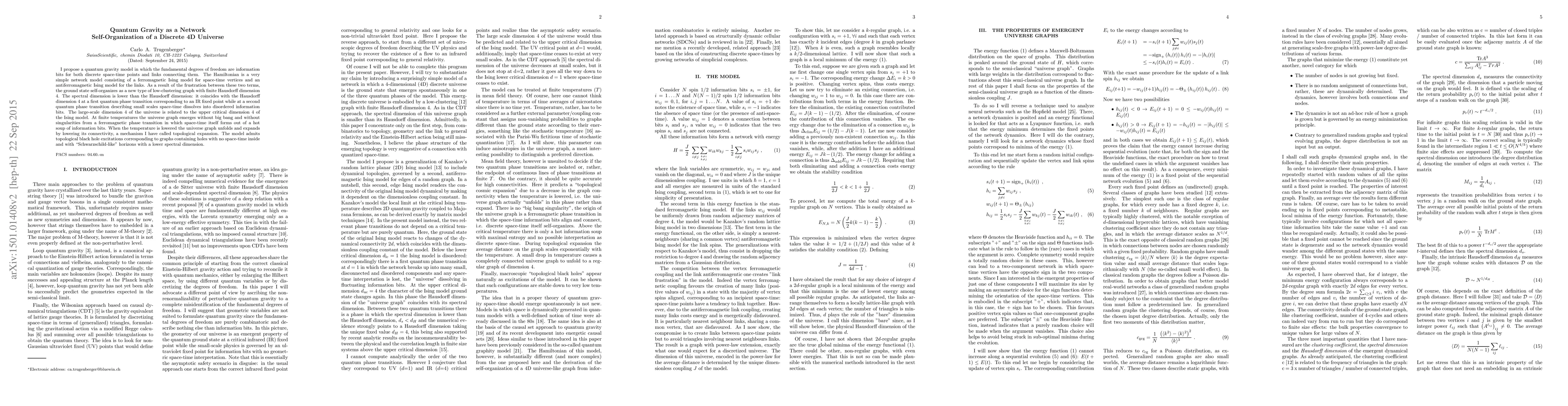 I propose a quantum gravity model in which the fundamental degrees of freedom are information bits for both discrete space-time points and links connecting them. The Hamiltonian is a very simple network model consisting of a ferromagnetic Ising model for space-time vertices and an antiferromagnetic Ising model for the links. As a result of the frustration between these two terms, the ground state self-organizes as a new type of low-clustering graph with finite Hausdorff dimension 4. The spectral dimension is lower than the Hausdorff dimension: it coincides with the Hausdorff dimension 4 at a first quantum phase transition corresponding to an IR fixed point while at a second quantum phase transition describing small scales space-time dissolves into disordered information bits. The large-scale dimension 4 of the universe is related to the upper critical dimension 4 of the Ising model. At finite temperatures the universe graph emerges without big bang and without singularities from a ferromagnetic phase transition in which space-time itself forms out of a hot soup of information bits. When the temperature is lowered the universe graph unfolds and expands by lowering its connectivity, a mechanism I have called topological expansion. The model admits topological black hole excitations corresponding to graphs containing holes with no space-time inside and with "Schwarzschild-like" horizons with a lower spectral dimension.