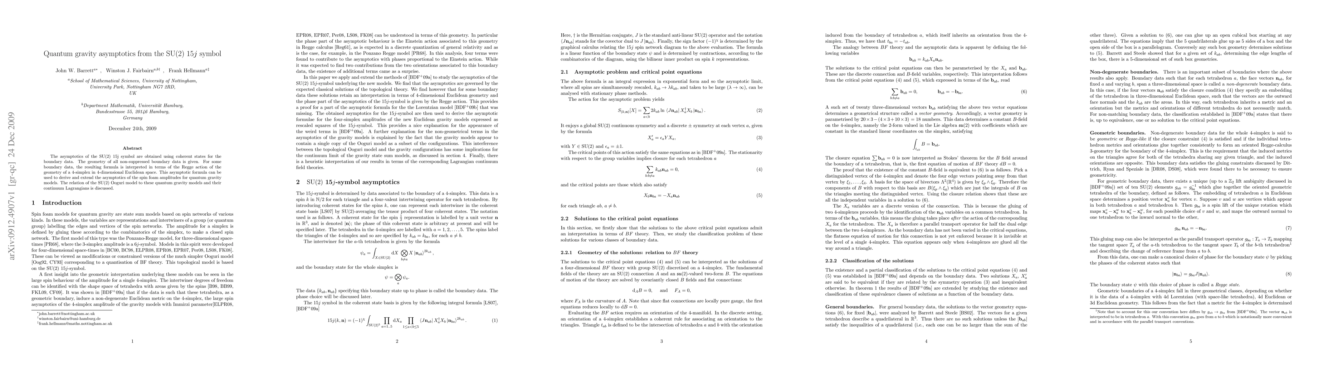 The asymptotics of the SU(2) 15j symbol are obtained using coherent states for the boundary data. The geometry of all non-suppressed boundary data is given. For some boundary data, the resulting formula is interpreted in terms of the Regge action of the geometry of a 4-simplex in 4-dimensional Euclidean space. This asymptotic formula can be used to derive and extend the asymptotics of the spin foam amplitudes for quantum gravity models. The relation of the SU(2) Ooguri model to these quantum gravity models and their continuum Lagrangians is discussed.