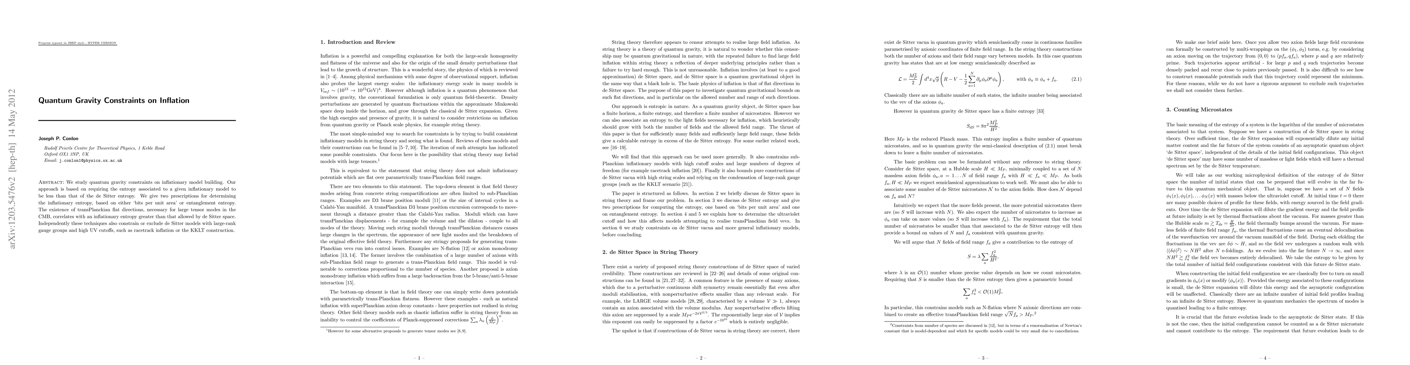 We study quantum gravity constraints on inflationary model building. Our approach is based on requiring the entropy associated to a given inflationary model to be less than that of the de Sitter entropy. We give two prescriptions for determining the inflationary entropy, based on either `bits per unit area' or entanglement entropy. The existence of transPlanckian flat directions, necessary for large tensor modes in the CMB, correlates with an inflationary entropy greater than that allowed by de Sitter space. Independently these techniques also constrain or exclude de Sitter models with large-rank gauge groups and high UV cutoffs, such as racetrack inflation or the KKLT construction.