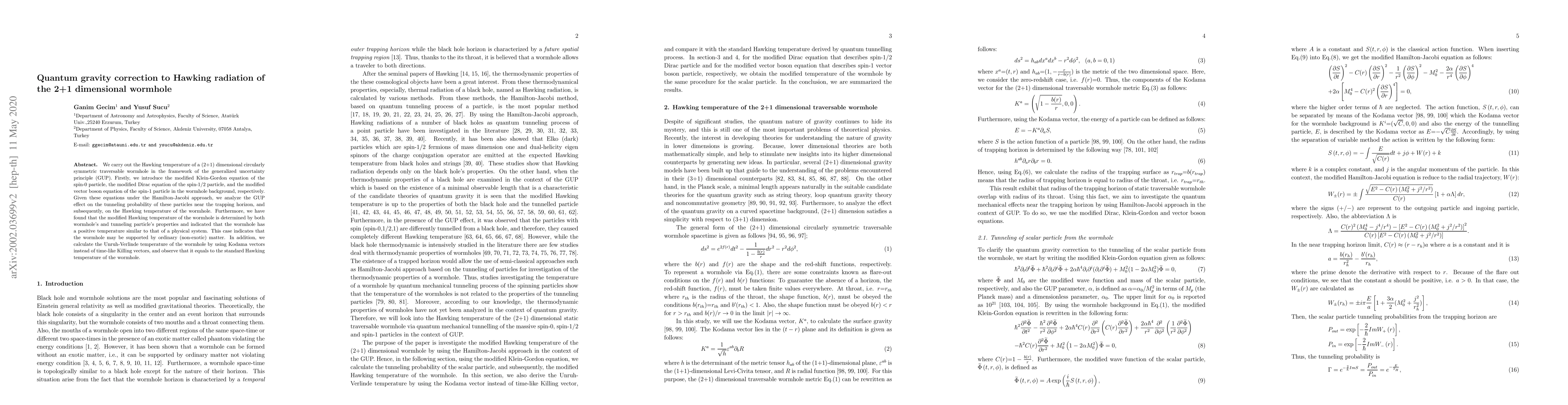 This paper investigates the Hawking temperature of a (2+1) dimensional wormhole using the generalized uncertainty principle (GUP) to modify the equations for spin-0, spin-1/2, and spin-1 particles. It finds that the GUP affects the tunneling probability and results in a modified Hawking temperature, indicating the wormhole could be supported by ordinary matter.