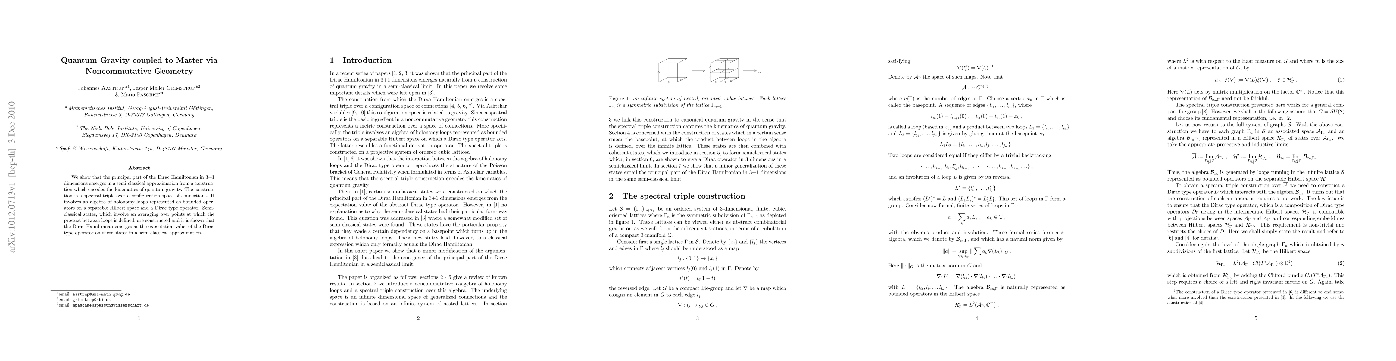 We show that the principal part of the Dirac Hamiltonian in 3+1 dimensions emerges in a semi-classical approximation from a construction which encodes the kinematics of quantum gravity. The construction is a spectral triple over a configuration space of connections. It involves an algebra of holonomy loops represented as bounded operators on a separable Hilbert space and a Dirac type operator. Semi-classical states, which involve an averaging over points at which the product between loops is defined, are constructed and it is shown that the Dirac Hamiltonian emerges as the expectation value of the Dirac type operator on these states in a semi-classical approximation.