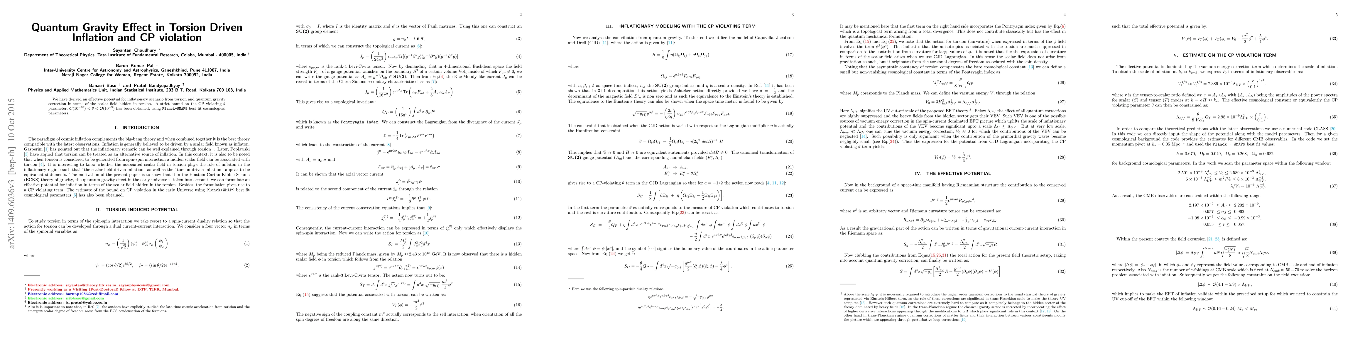 We have derived an effective potential for inflationary scenario from torsion and quantum gravity correction in terms of the scalar field hidden in torsion. A strict bound on the CP violating $\theta$ parameter, ${\cal O}(10^{-10})<\theta<{\cal O}(10^{-9})$ has been obtained, using {\tt Planck+WMAP9} best fit cosmological parameters.