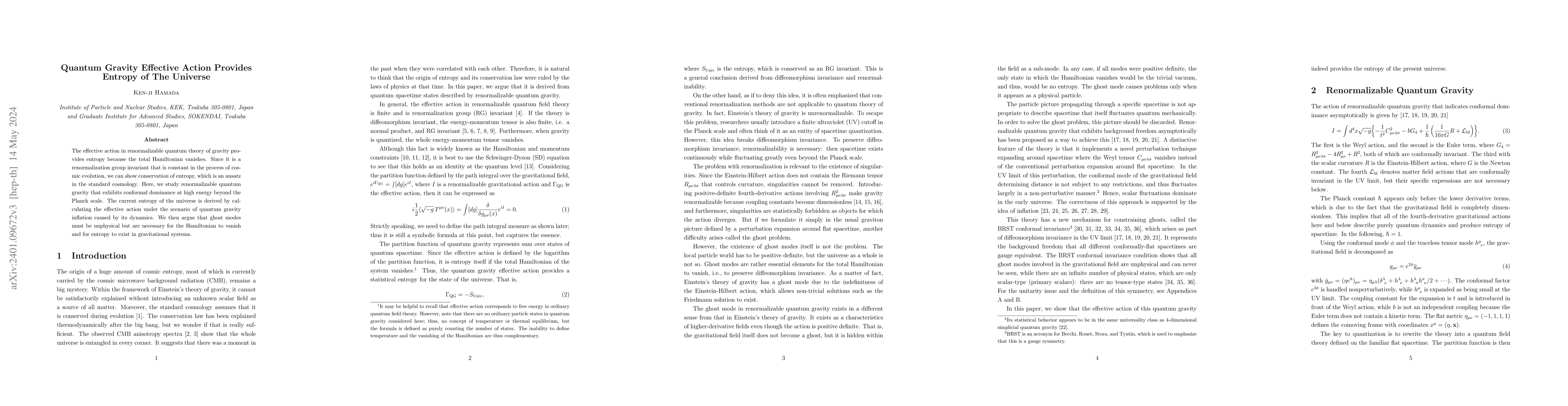 The effective action in renormalizable quantum theory of gravity provides entropy because the total Hamiltonian vanishes. Since it is a renormalization group invariant that is constant in the process of cosmic evolution, we can show conservation of entropy, which is an ansatz in the standard cosmology. Here, we study renormalizable quantum gravity that exhibits conformal dominance at high energy beyond the Planck scale. The current entropy of the universe is derived by calculating the effective action under the scenario of quantum gravity inflation caused by its dynamics. We then argue that ghost modes must be unphysical but are necessary for the Hamiltonian to vanish and for entropy to exist in gravitational systems.