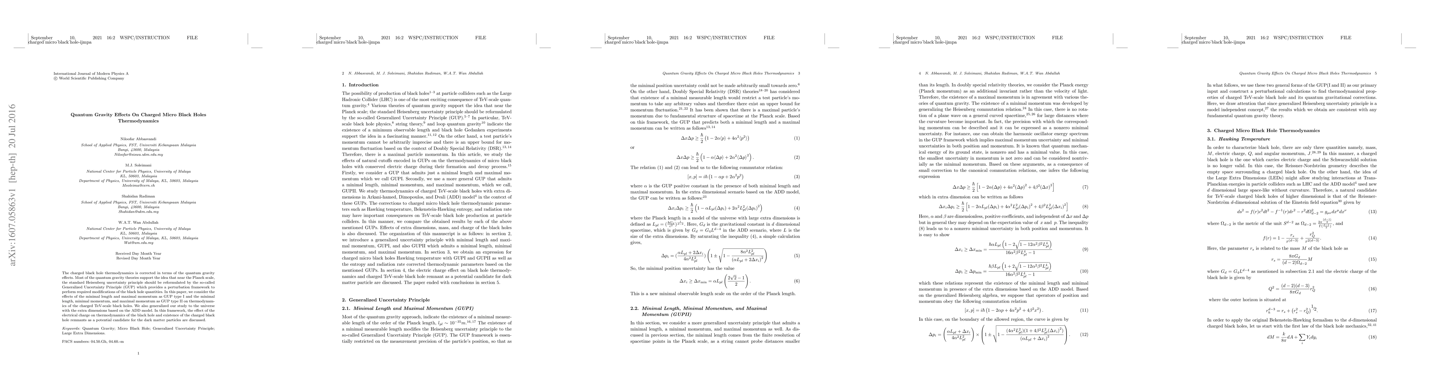 This paper examines the thermodynamics of charged micro black holes, incorporating quantum gravity effects through the Generalized Uncertainty Principle (GUP). It explores the implications of GUP types I and II on black hole quantities and discusses the potential existence of charged black hole remnants as dark matter candidates.