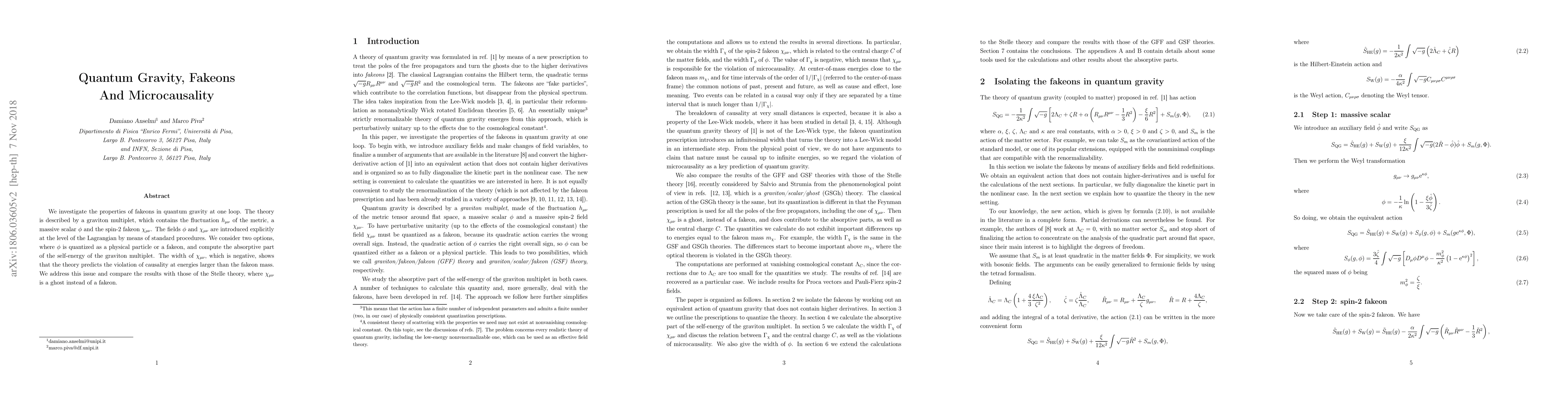 We investigate the properties of fakeons in quantum gravity at one loop. The theory is described by a graviton multiplet, which contains the fluctuation $h_{\mu \nu }$ of the metric, a massive scalar $\phi $ and the spin-2 fakeon $\chi _{\mu \nu }$. The fields $\phi $ and $\chi _{\mu \nu }$ are introduced explicitly at the level of the Lagrangian by means of standard procedures. We consider two options, where $\phi $ is quantized as a physical particle or a fakeon, and compute the absorptive part of the self-energy of the graviton multiplet. The width of $\chi _{\mu \nu }$, which is negative, shows that the theory predicts the violation of causality at energies larger than the fakeon mass. We address this issue and compare the results with those of the Stelle theory, where $\chi _{\mu \nu }$ is a ghost instead of a fakeon.