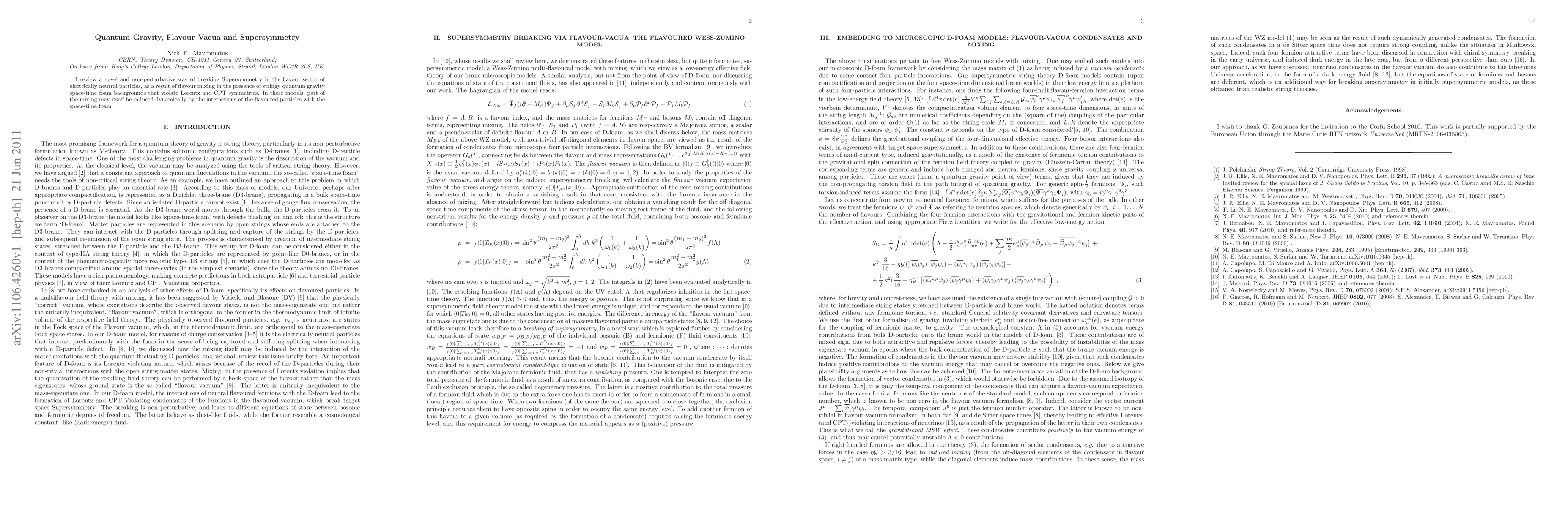 I review a novel and non-perturbative way of breaking Supersymmetry in the flavour sector of electrically neutral particles, as a result of flavour mixing in the presence of stringy quantum gravity space-time foam backgrounds that violate Lorentz and CPT symmetries. In these models, part of the mixing may itself be induced dynamically by the interactions of the flavoured particles with the space-time foam.