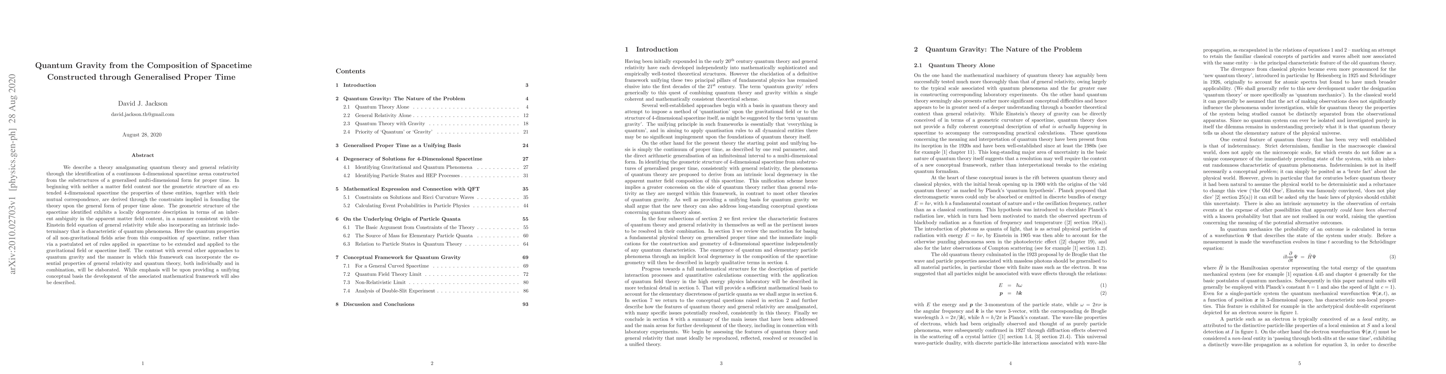We describe a theory amalgamating quantum theory and general relativity through the identification of a continuous 4-dimensional spacetime arena constructed from the substructures of a generalised multi-dimensional form for proper time. In beginning with neither a matter field content nor the geometric structure of an extended 4-dimensional spacetime the properties of these entities, together with their mutual correspondence, are derived through the constraints implied in founding the theory upon the general form of proper time alone. The geometric structure of the spacetime identified exhibits a locally degenerate description in terms of an inherent ambiguity in the apparent matter field content, in a manner consistent with the Einstein field equation of general relativity while also incorporating an intrinsic indeterminacy that is characteristic of quantum phenomena. Here the quantum properties of all non-gravitational fields arise from this composition of spacetime, rather than via a postulated set of rules applied in spacetime to be extended and applied to the gravitational field or spacetime itself. The contrast with several other approaches to quantum gravity and the manner in which this framework can incorporate the essential properties of general relativity and quantum theory, both individually and in combination, will be elaborated. While emphasis will be upon providing a unifying conceptual basis the development of the associated mathematical framework will also be described.