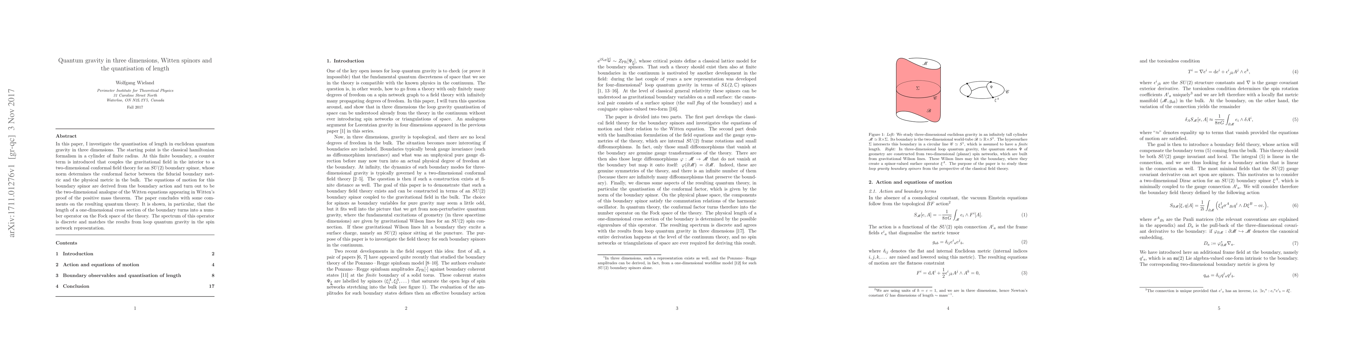 In this paper, I investigate the quantisation of length in euclidean quantum gravity in three dimensions. The starting point is the classical hamiltonian formalism in a cylinder of finite radius. At this finite boundary, a counter term is introduced that couples the gravitational field in the interior to a two-dimensional conformal field theory for an SU(2) boundary spinor, whose norm determines the conformal factor between the fiducial boundary metric and the physical metric in the bulk. The equations of motion for this boundary spinor are derived from the boundary action and turn out to be the two-dimensional analogue of the Witten equations appearing in Witten's proof of the positive mass theorem. The paper concludes with some comments on the resulting quantum theory. It is shown, in particular, that the length of a one-dimensional cross section of the boundary turns into a number operator on the Fock space of the theory. The spectrum of this operator is discrete and matches the results from loop quantum gravity in the spin network representation.
