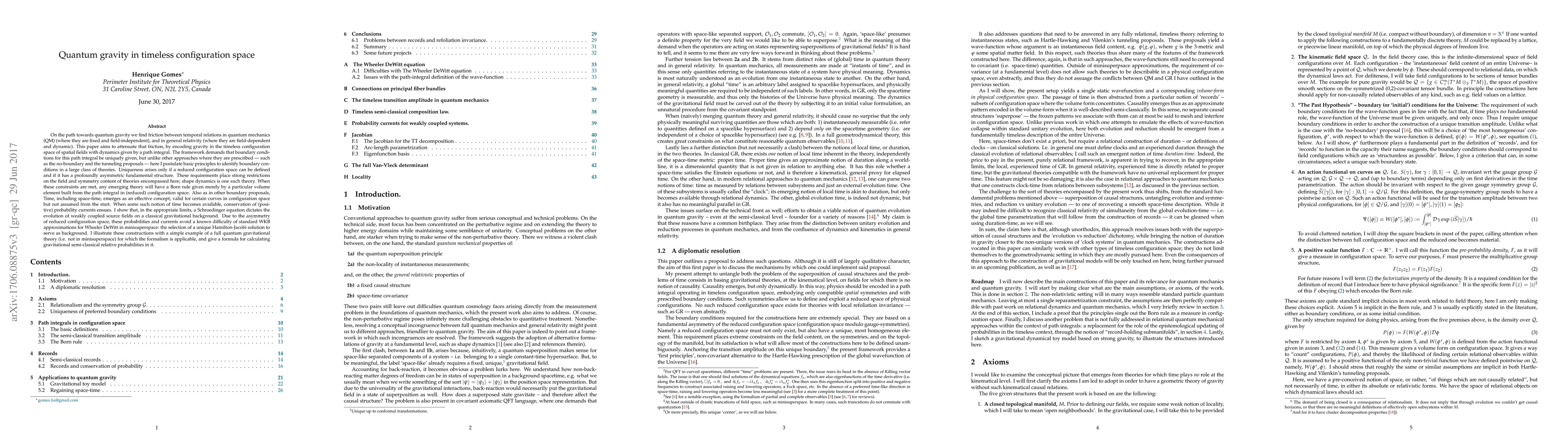 On the path towards quantum gravity, we find friction between temporal relations in quantum mechanics (QM) (where they are fixed and field-independent), and in general relativity (where they are field-dependent and dynamic). This paper aims to attenuate that friction, by encoding gravity in the timeless configuration space of spatial fields with dynamics given by a path integral. The framework demands that boundary conditions for this path integral be uniquely given, but unlike other approaches where they are prescribed --- such as the no-boundary and the tunneling proposals --- here I postulate basic principles to identify boundary conditions in a large class of theories. Uniqueness arises only if a reduced configuration space can be defined and if it has a profoundly asymmetric fundamental structure. These requirements place strong restrictions on the field and symmetry content of theories encompassed here; shape dynamics is one such theory. Also as in other boundary proposals, Time, including space-time, emerges as an effective concept; valid for certain curves in configuration space but not assumed from the start. When some such notion of time becomes available, conservation of (positive) probability currents ensues. I show that, in the appropriate limits, a Schroedinger equation dictates the evolution of weakly coupled source fields on a classical gravitational background. Due to the asymmetry of reduced configuration space, these probabilities and currents avoid a known difficulty of standard WKB approximations for Wheeler DeWitt in minisuperspace: the selection of a unique Hamilton-Jacobi solution to serve as background. I illustrate these constructions with a simple example of a full quantum gravitational theory (i.e. not in minisuperspace) for which the formalism is applicable, and give a formula for calculating gravitational semi-classical relative probabilities in it.