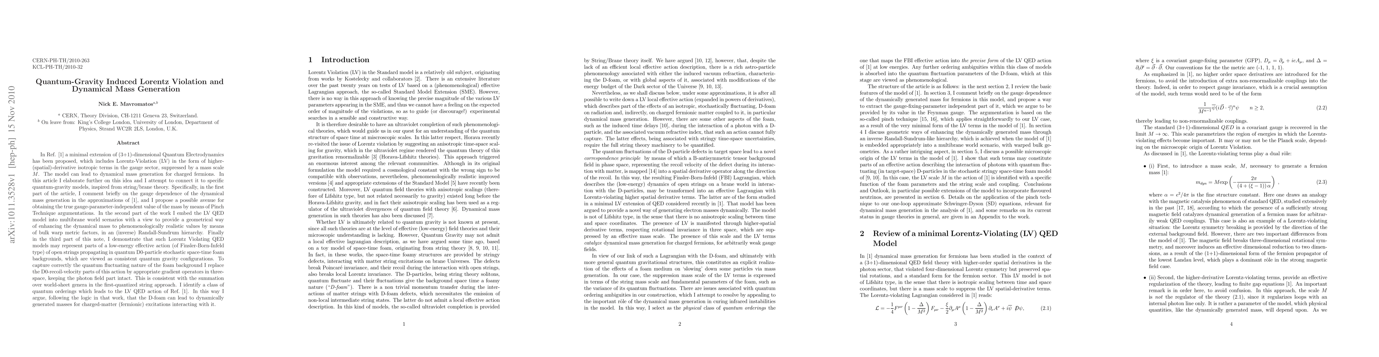 In Ref. [1] (by J. Alexandre) a minimal extension of (3+1)-dimensional Quantum Electrodynamics has been proposed, which includes Lorentz-Violation (LV) in the form of higher-(spatial)-derivative isotropic terms in the gauge sector, suppressed by a mass scale $M$. The model can lead to dynamical mass generation for charged fermions. In this article I elaborate further on this idea and I attempt to connect it to specific quantum-gravity models, inspired from string/brane theory. Specifically, in the first part of the article, I comment briefly on the gauge dependence of the dynamical mass generation in the approximations of [1], and I propose a possible avenue for obtaining the true gauge-parameter-independent value of the mass by means of Pinch Technique argumentations. In the second part of the work I embed the LV QED model into multibrane world scenarios with a view to provide a geometrical way of enhancing the dynamical mass to phenomenologically realistic values by means of bulk warp metric factors, in an (inverse) Randall-Sundrum hierarchy. Finally in the third part of this note, I demonstrate that such Lorentz Violating QED models may represent parts of a low-energy effective action (of Finsler-Born-Infeld type) of open strings propagating in quantum D0-particle stochastic space-time foam backgrounds, which are viewed as consistent quantum gravity configurations.