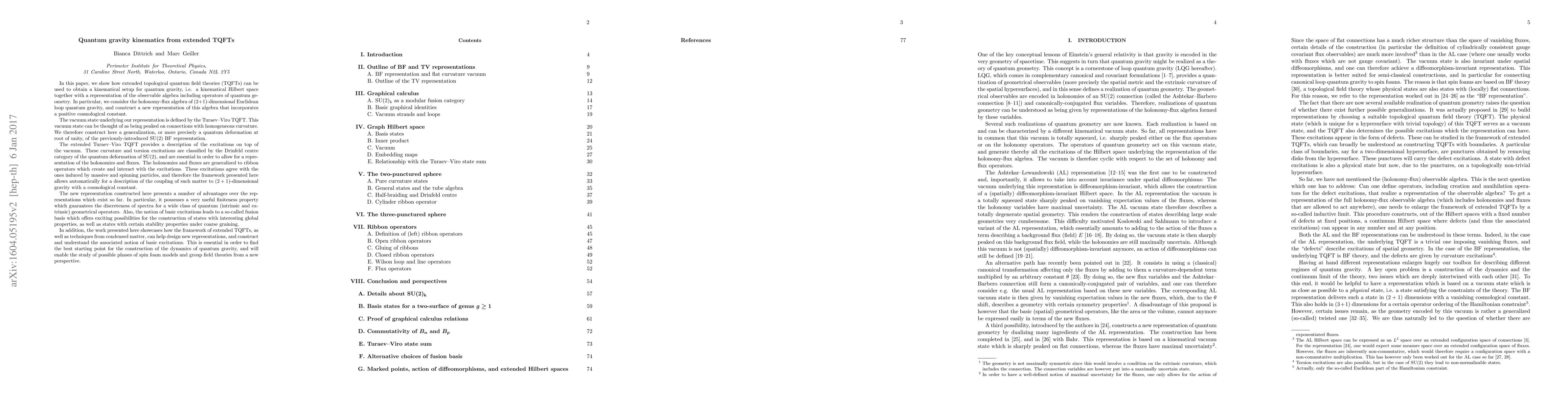 This paper demonstrates how extended topological quantum field theories (TQFTs) can construct a kinematical framework for quantum gravity, including a representation of the observable algebra and quantum geometry operators. It introduces a new representation of the holonomy-flux algebra in (2+1)-dimensional Euclidean loop quantum gravity, incorporating a positive cosmological constant, and highlights advantages such as discreteness of spectra and a fusion basis for constructing states with global properties.