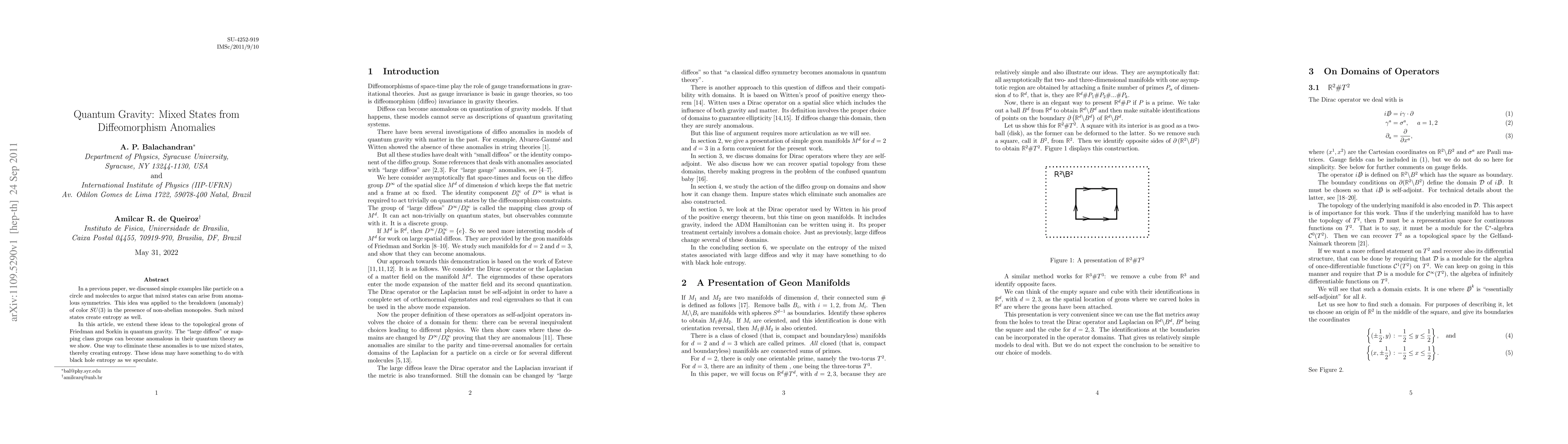 In a previous paper, we discussed simple examples like particle on a circle and molecules to argue that mixed states can arise from anomalous symmetries. This idea was applied to the breakdown (anomaly) of color SU(3) in the presence of non-abelian monopoles. Such mixed states create entropy as well. In this article, we extend these ideas to the topological geons of Friedman and Sorkin in quantum gravity. The "large diffeos" or mapping class groups can become anomalous in their quantum theory as we show. One way to eliminate these anomalies is to use mixed states, thereby creating entropy. These ideas may have something to do with black hole entropy as we speculate.