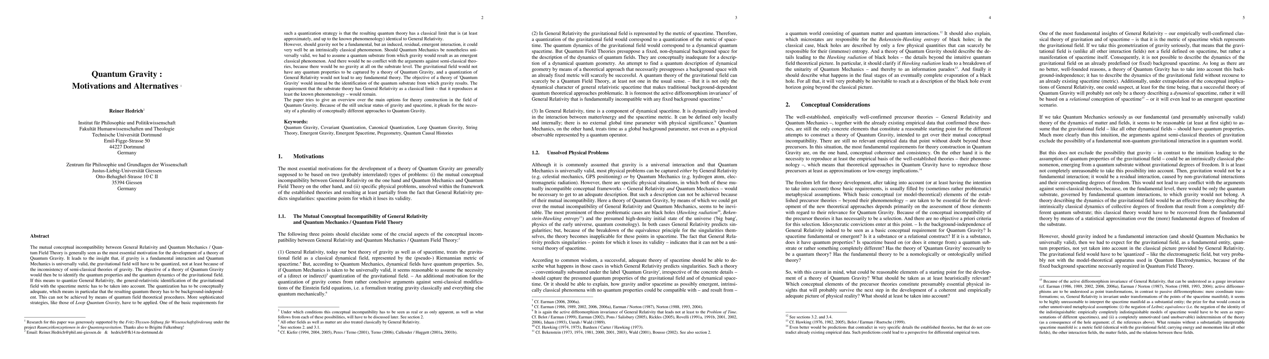 The mutual conceptual incompatibility between GR and QM/QFT is generally seen as the most essential motivation for the development of a theory of Quantum Gravity (QG). It leads to the insight that, if gravity is a fundamental interaction and QM is universally valid, the gravitational field will have to be quantized, not at least because of the inconsistency of semi-classical theories of gravity. If this means to quantize GR, its identification of the gravitational field with the spacetime metric has to be taken into account. And the resulting quantum theory has to be background-independent. This can not be achieved by means of quantum field theoretical procedures. More sophisticated strategies have to be applied. One of the basic requirements for such a quantization strategy is that the resulting quantum theory has GR as a classical limit. - However, should gravity not be a fundamental, but an residual, emergent interaction, it could very well be an intrinsically classical phenomenon. Should QM be nonetheless universally valid, we had to assume a quantum substrate from which gravity would result as an emergent classical phenomenon. And there would be no conflict with the arguments against semi-classical theories, because there would be no gravity at all on the substrate level. The gravitational field would not have any quantum properties, and a quantization of GR would not lead to any fundamental theory. The objective of a theory of 'QG' would instead be the identification of the quantum substrate from which gravity results. - The paper tries to give an overview over the main options for theory construction in the field of QG. Because of the still unclear status of gravity and spacetime, it pleads for the necessity of a plurality of conceptually different approaches to QG.