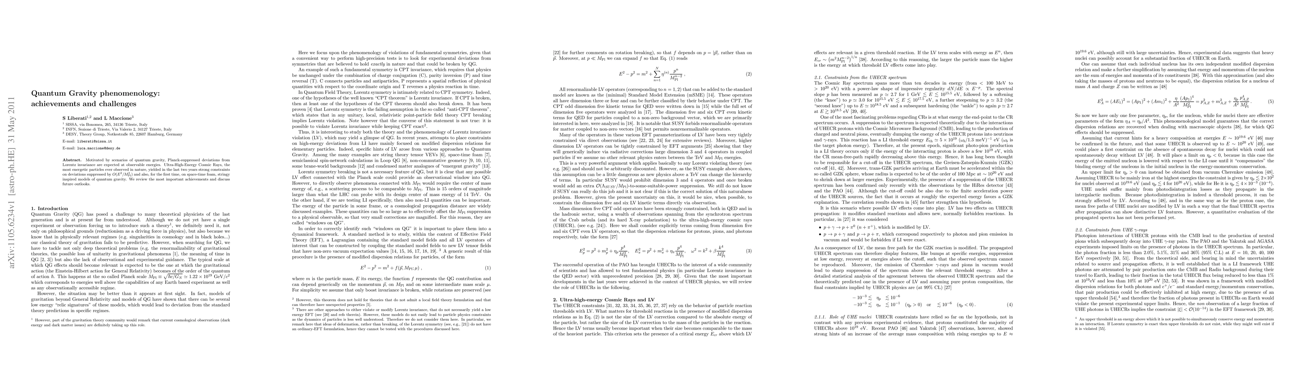 Motivated by scenarios of quantum gravity, Planck-suppressed deviations from Lorentz invariance are expected at observable energies. Ultra-High-Energy Cosmic Rays, the most energetic particles ever observed in nature, yielded in the last two years strong constraints on deviations suppressed by $O(E^{2}/\Mpl^{2})$ and also, for the first time, on space-time foam, stringy inspired models of quantum gravity. We review the most important achievements and discuss future outlooks.
