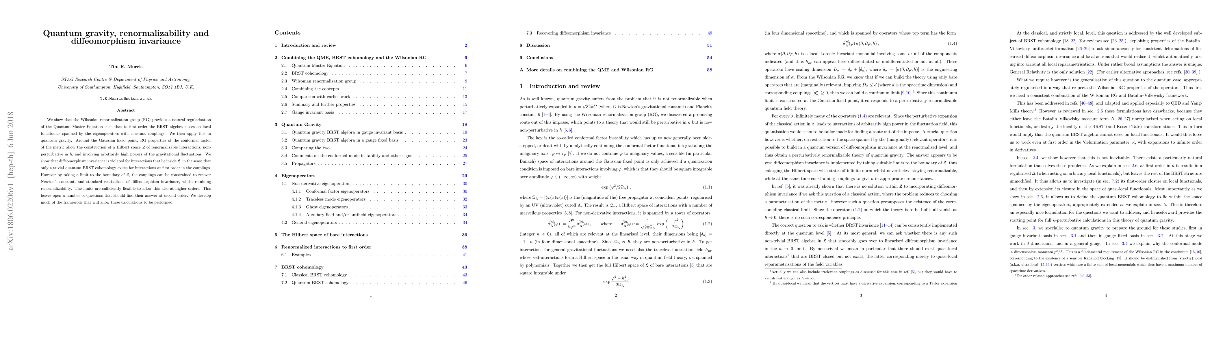 We show that the Wilsonian renormalization group (RG) provides a natural regularisation of the Quantum Master Equation such that to first order the BRST algebra closes on local functionals spanned by the eigenoperators with constant couplings. We then apply this to quantum gravity. Around the Gaussian fixed point, RG properties of the conformal factor of the metric allow the construction of a Hilbert space $\mathfrak{L}$ of renormalizable interactions, non-perturbative in $\hbar$, and involving arbitrarily high powers of the gravitational fluctuations. We show that diffeomorphism invariance is violated for interactions that lie inside $\mathfrak{L}$, in the sense that only a trivial quantum BRST cohomology exists for interactions at first order in the couplings. However by taking a limit to the boundary of $\mathfrak{L}$, the couplings can be constrained to recover Newton's constant, and standard realisations of diffeomorphism invariance, whilst retaining renormalizability. The limits are sufficiently flexible to allow this also at higher orders. This leaves open a number of questions that should find their answer at second order. We develop much of the framework that will allow these calculations to be performed.