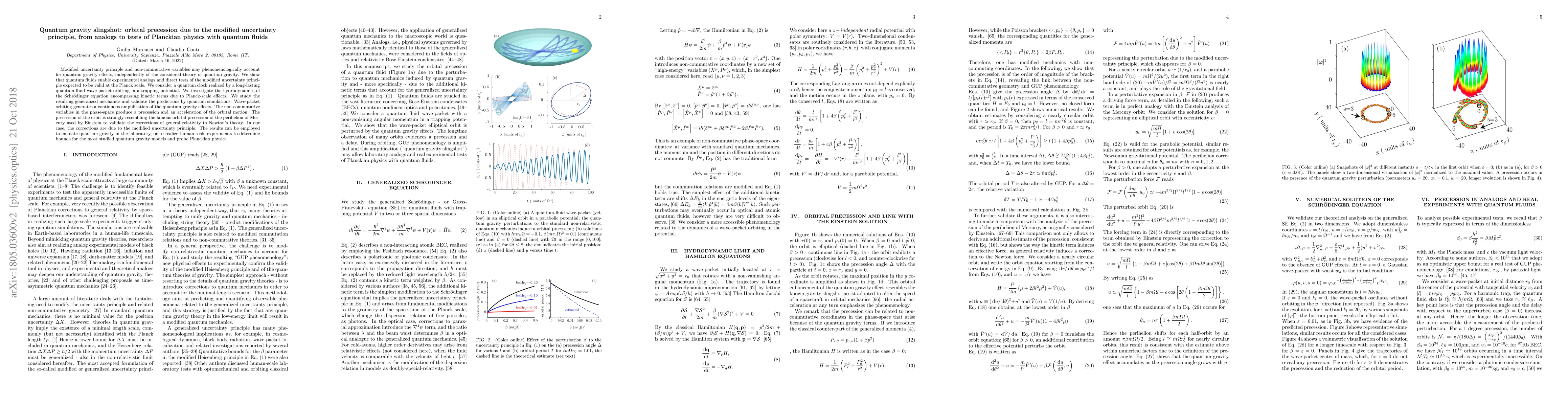 This paper explores how quantum fluids can serve as analogs to test quantum gravity effects through the modified uncertainty principle, demonstrating orbital precession akin to general relativity's perihelion shift, and proposing potential experiments to probe Planckian physics. Quantum simulations validate the predictions of generalized mechanics incorporating Planck-scale kinetic terms.