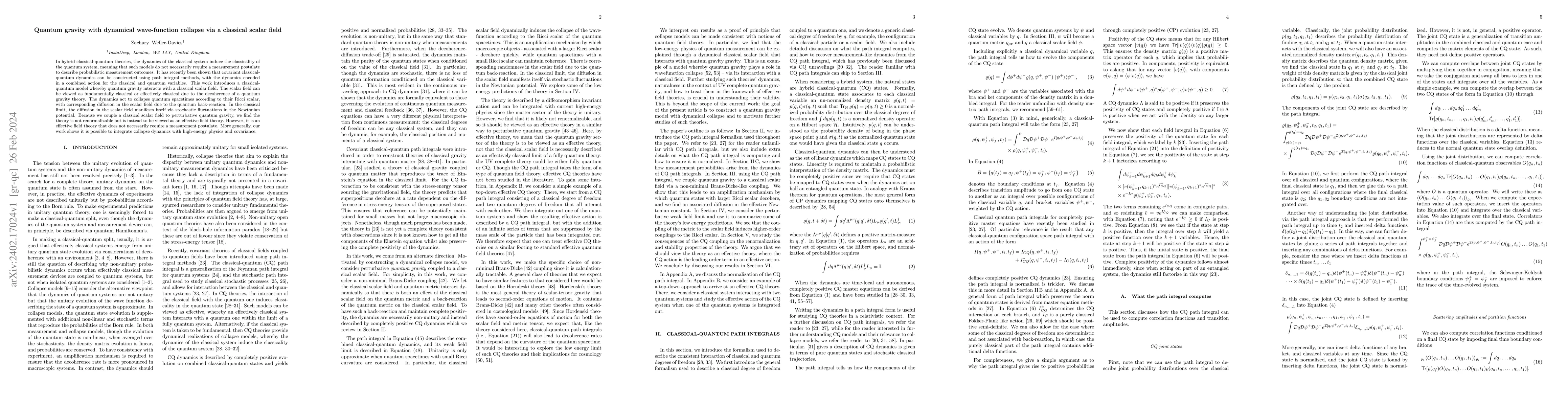 This paper proposes a hybrid classical-quantum model where quantum gravity interacts with a classical scalar field, leading to a dynamical wave-function collapse without a measurement postulate. The model is effective but non-renormalizable, integrating collapse dynamics with high-energy physics and covariance.
