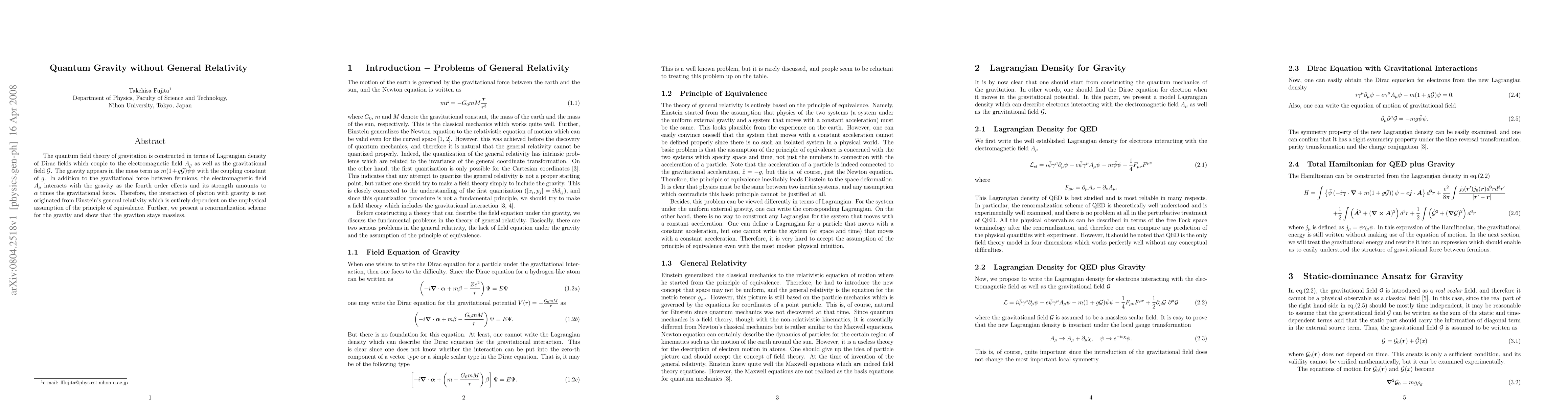 The quantum field theory of gravitation is constructed in terms of Lagrangian density of Dirac fields which couple to the electromagnetic field $A_\mu$ as well as the gravitational field $\cal G$. The gravity appears in the mass term as $ m(1+g {\cal G}) \bar{\psi}\psi $ with the coupling constant of $g$. In addition to the gravitational force between fermions, the electromagnetic field $A_\mu$ interacts with the gravity as the fourth order effects and its strength amounts to $\alpha$ times the gravitational force. Therefore, the interaction of photon with gravity is not originated from Einstein's general relativity which is entirely dependent on the unphysical assumption of the principle of equivalence. Further, we present a renormalization scheme for the gravity and show that the graviton stays massless.