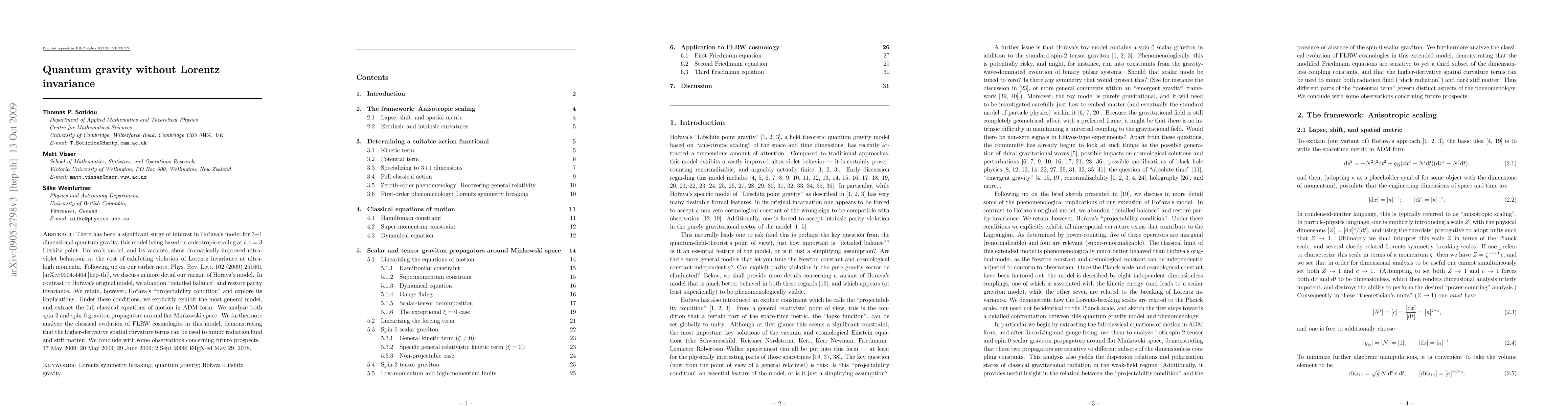 There has been a significant surge of interest in Horava's model for 3+1 dimensional quantum gravity, this model being based on anisotropic scaling at a z=3 Lifshitz point. Horava's model, and its variants, show dramatically improved ultra-violet behaviour at the cost of exhibiting violation of Lorentz invariance at ultra-high momenta. Following up on our earlier note, [arXiv:0904.4464 [hep-th]], we discuss in more detail our variant of Horava's model. In contrast to Horava's original model, we abandon "detailed balance" and restore parity invariance. We retain, however, Horava's "projectability condition" and explore its implications. Under these conditions, we explicitly exhibit the most general model, and extract the full classical equations of motion in ADM form. We analyze both spin-2 and spin-0 graviton propagators around flat Minkowski space. We furthermore analyze the classical evolution of FLRW cosmologies in this model, demonstrating that the higher-derivative spatial curvature terms can be used to mimic radiation fluid and stiff matter. We conclude with some observations concerning future prospects.
