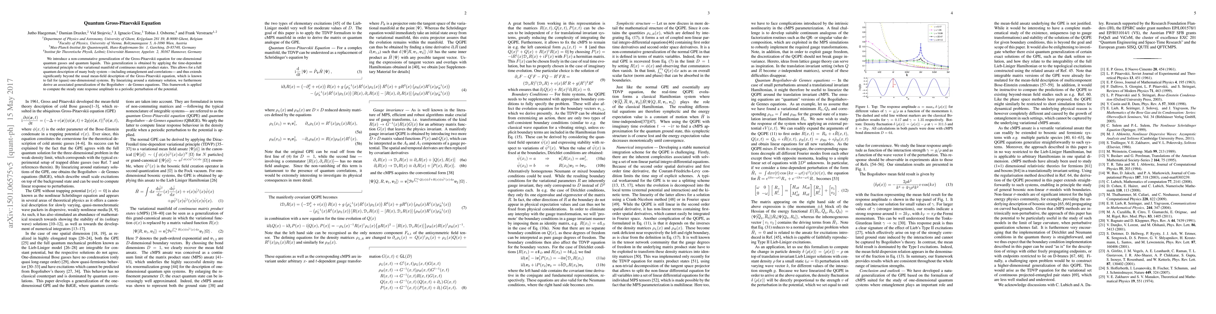 This paper presents a non-commutative generalization of the Gross-Pitaevskii equation for quantum gases and liquids, utilizing continuous matrix product states for a full quantum description. It also derives a generalized Bogoliubov-de Gennes equation and applies the framework to compute steady-state response amplitudes to periodic potential perturbations.
